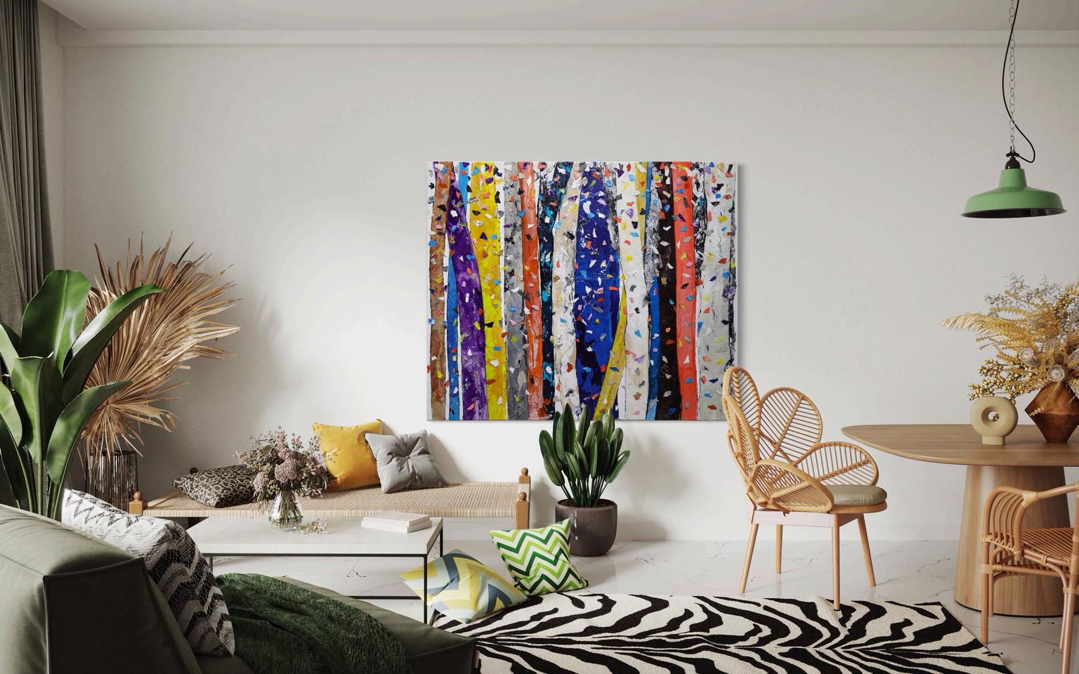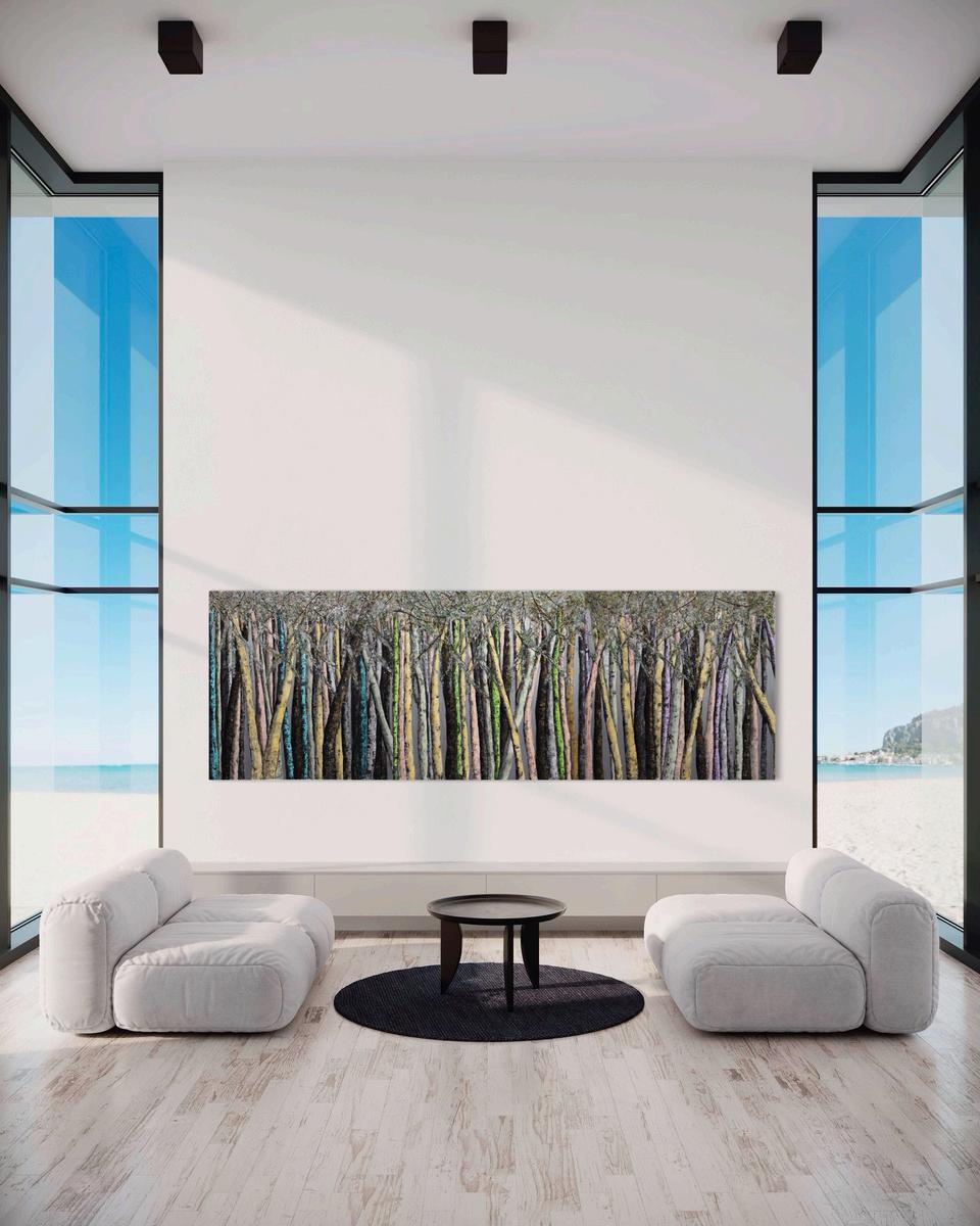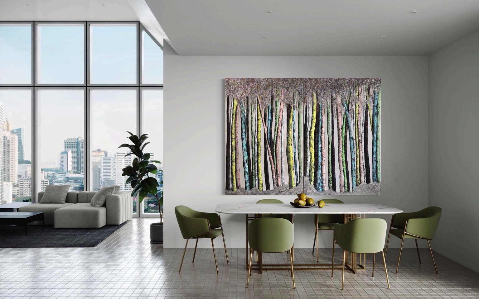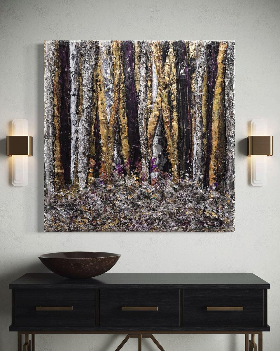 Drawing inspiration from the legendary artists Wolf Kahn and Anselm Kiefer, Mashian incorporates a stunning array of colors muted and vibrant each piece a unique creation yet harmoniously linked within the others from the collection. From deep alizarian red and burnt umber to shimmering hues of silver, gold blues and creamy whites, her work reflects the everchanging beauty of nature and the human experience.