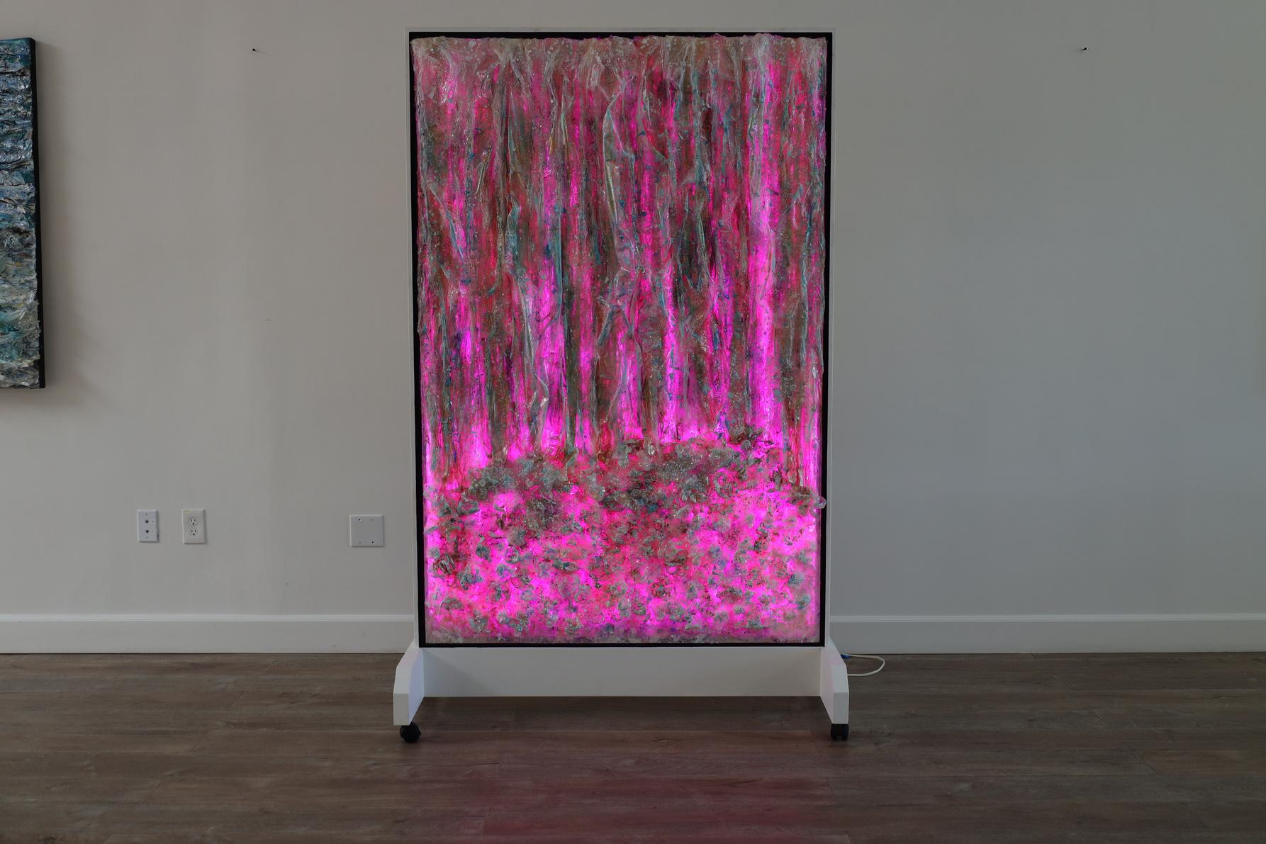 The Tree Series presents an intricate study of positive and negative space and the mystery of multitudes in minimalism. These canvases, often large-scale, have the effect of walking into a multicolored forest.