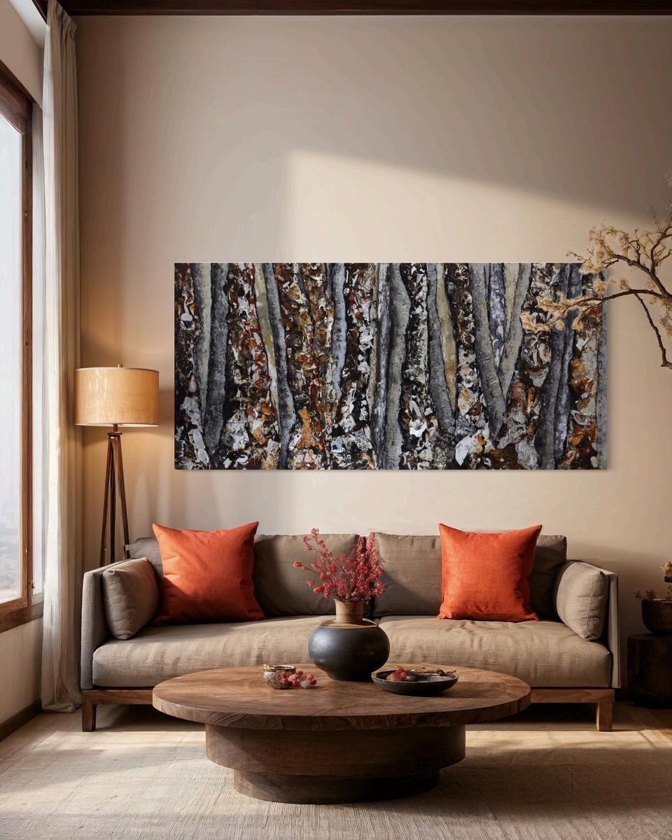 EMBER ECHOES MIXED MEDIA ON CANVAS 23 X 48 IN EACH (55 X 122 CM)
