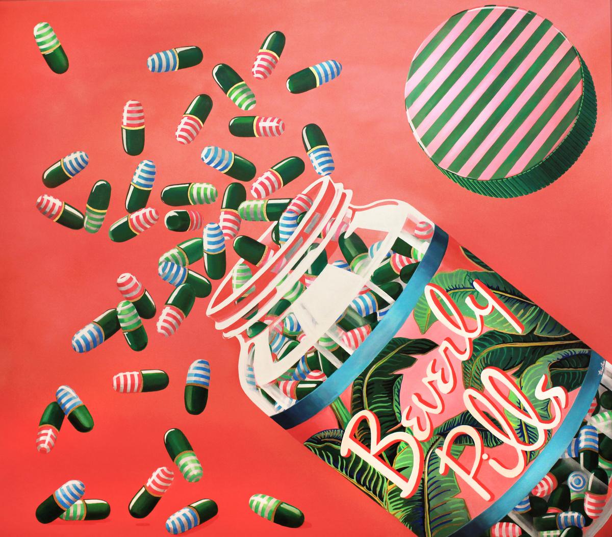 Acrylic and spray paint on canvas, Ceramic pills 54" x 62"