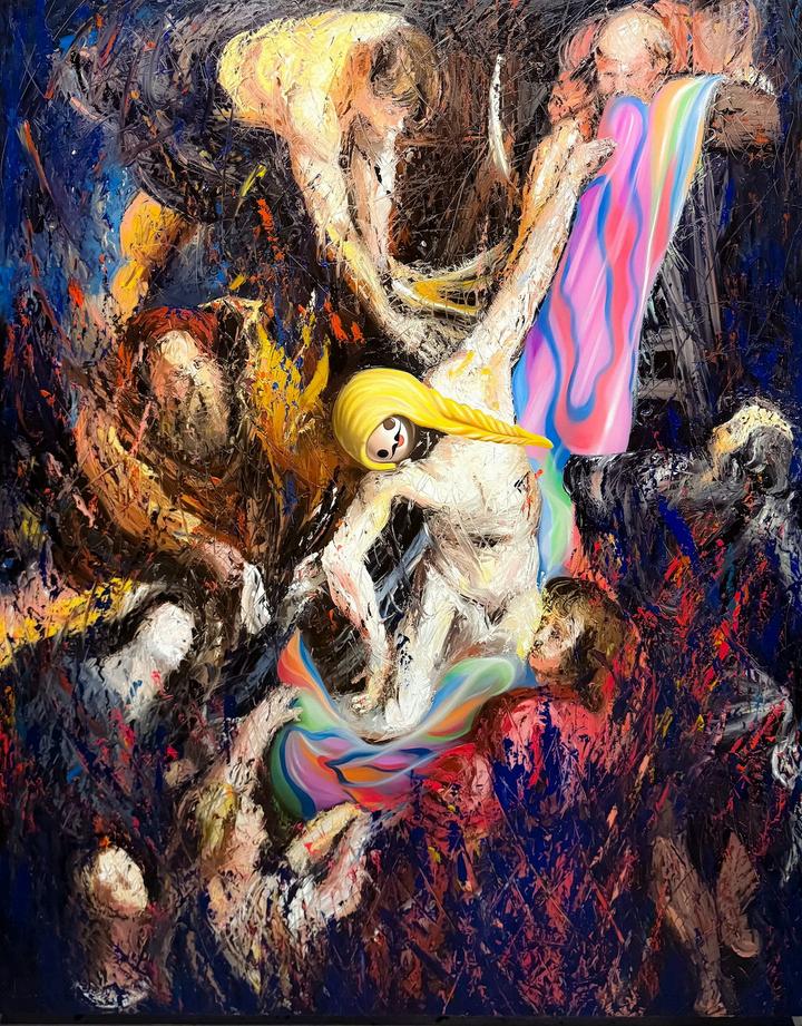 IVAN MADRIGAL “FREE BUT NOT CONSCIOUS” OIL ON SPATULA AND BRUSH, IN COTTON FABRIC, UV FREE