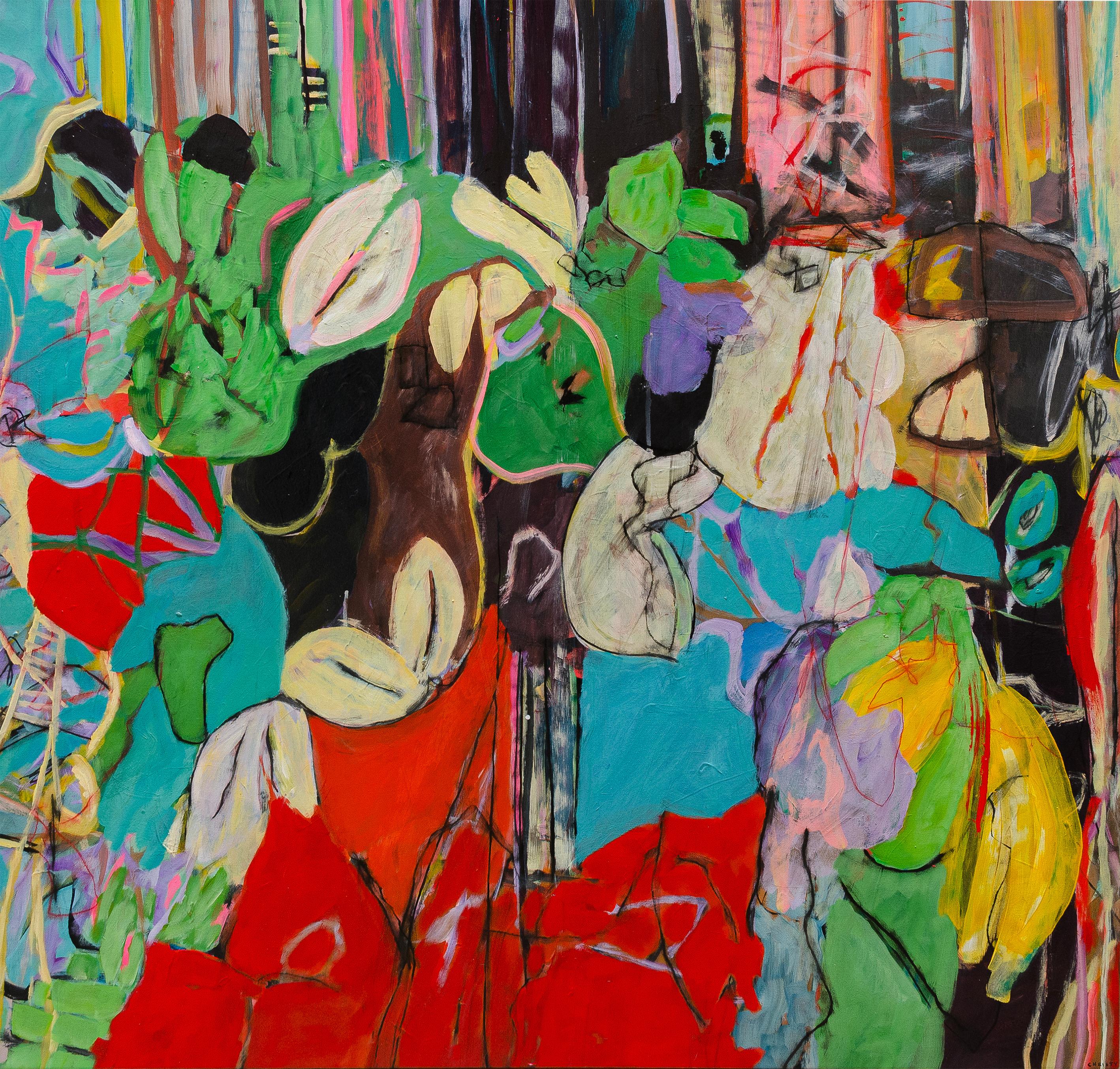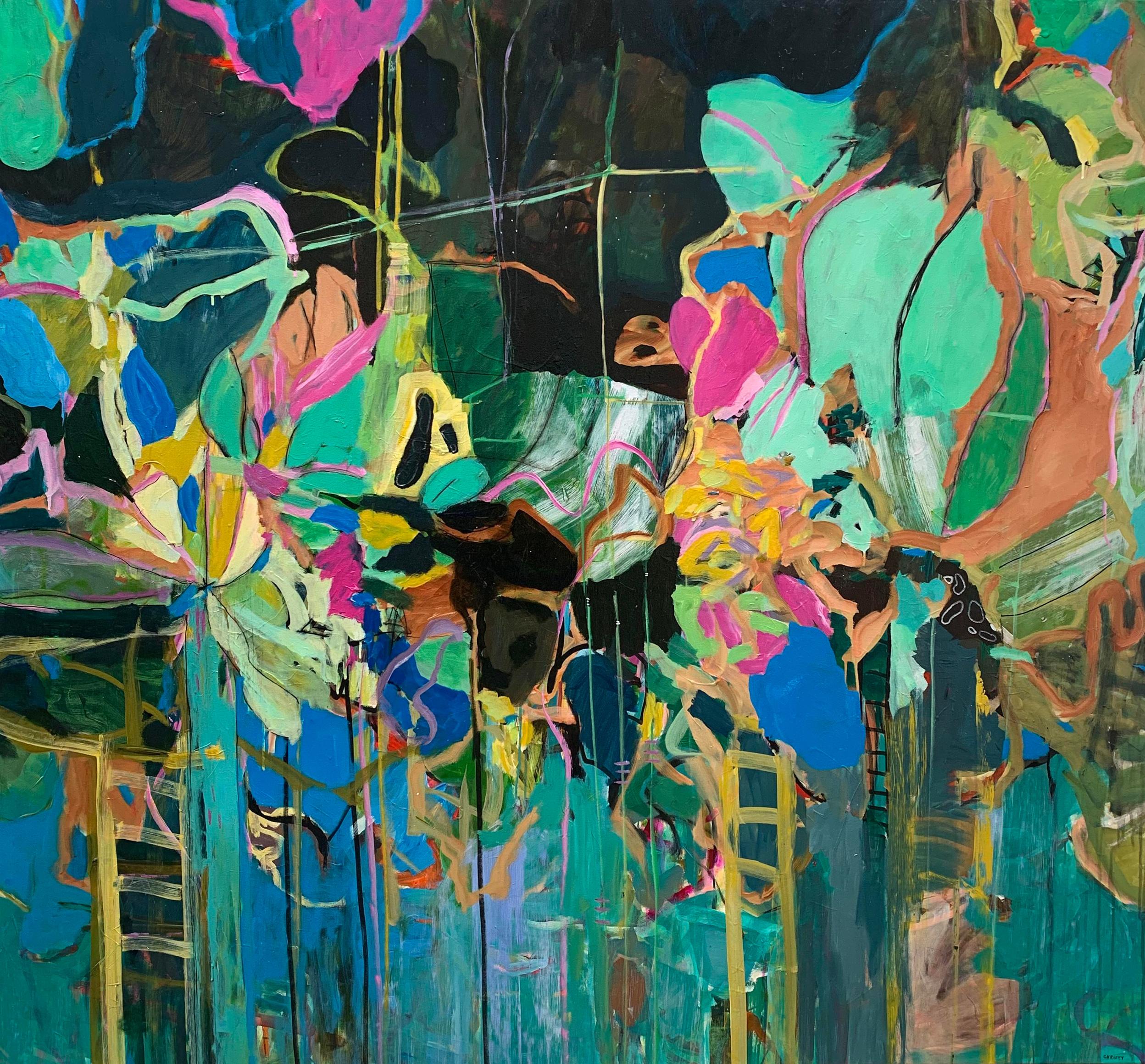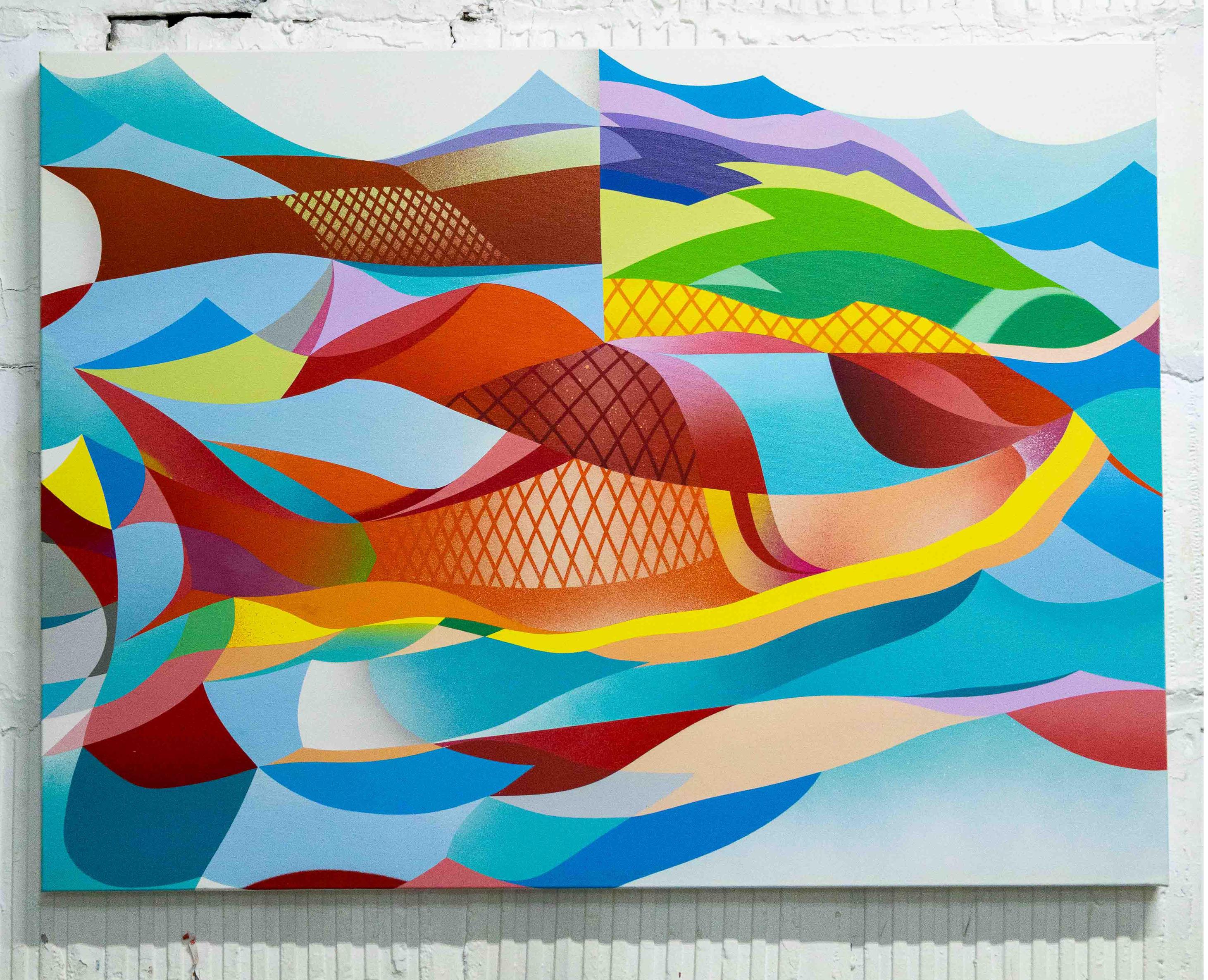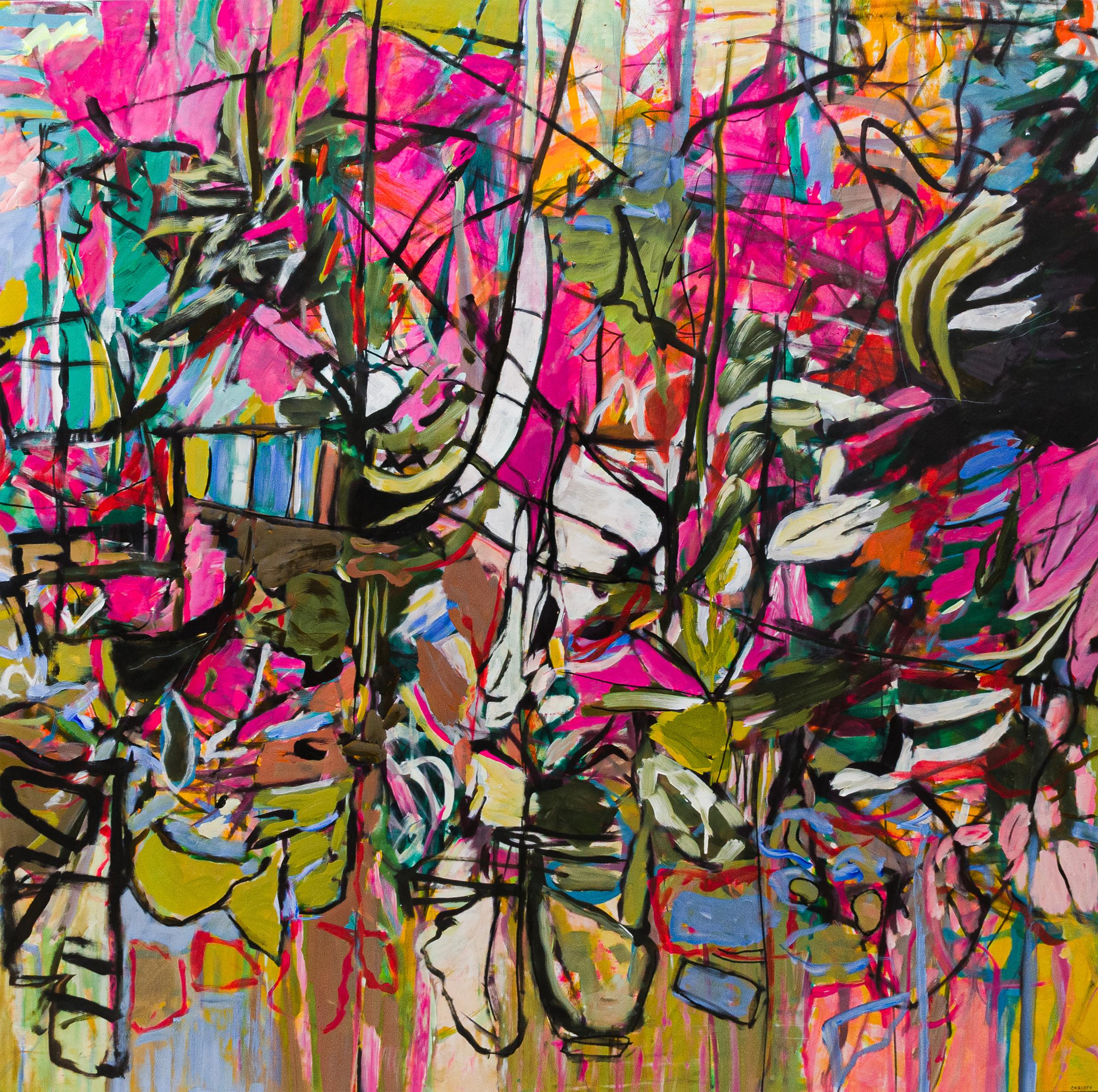By Dual Acrylic, aerosol, tape and varnish on linen