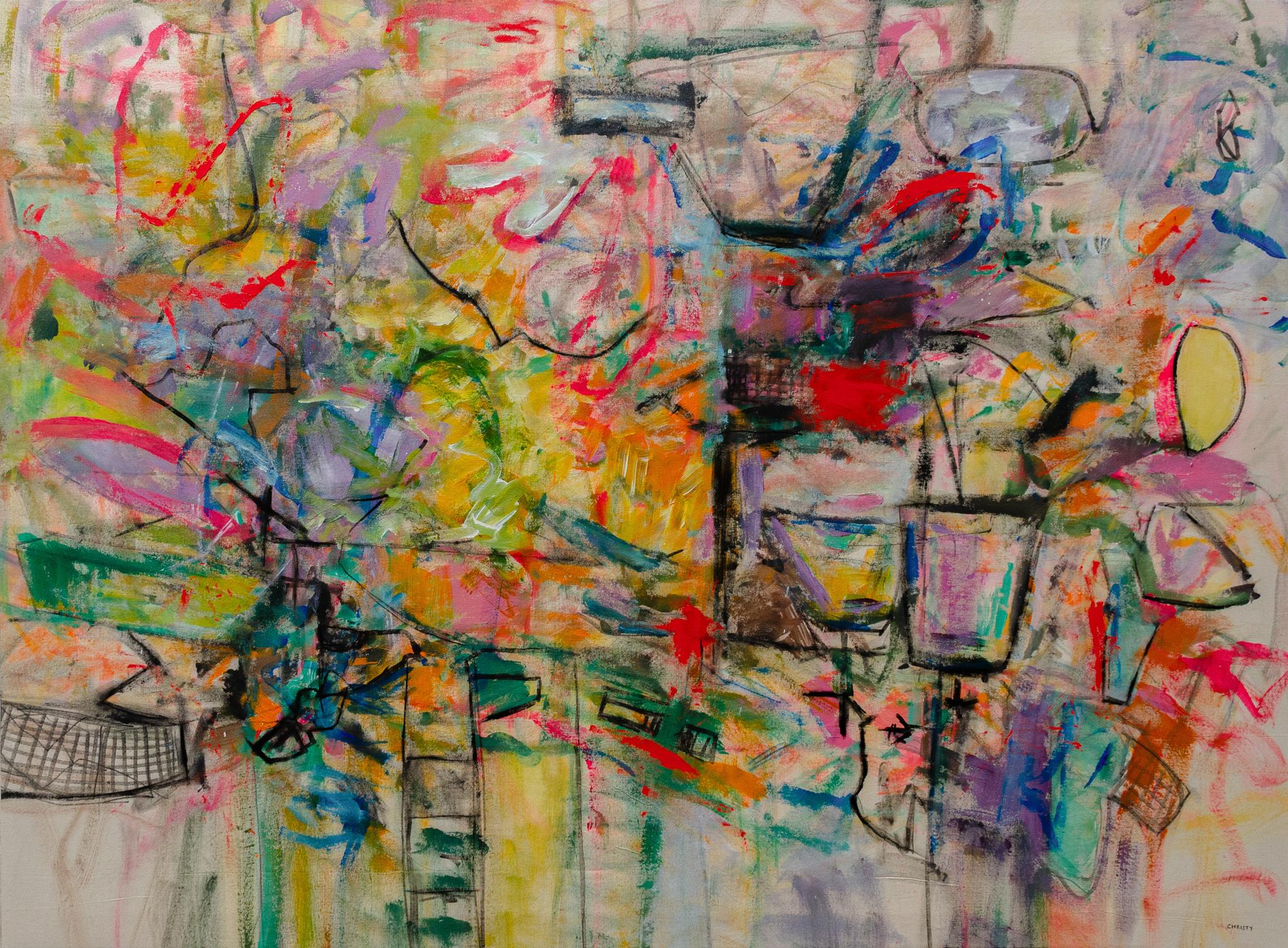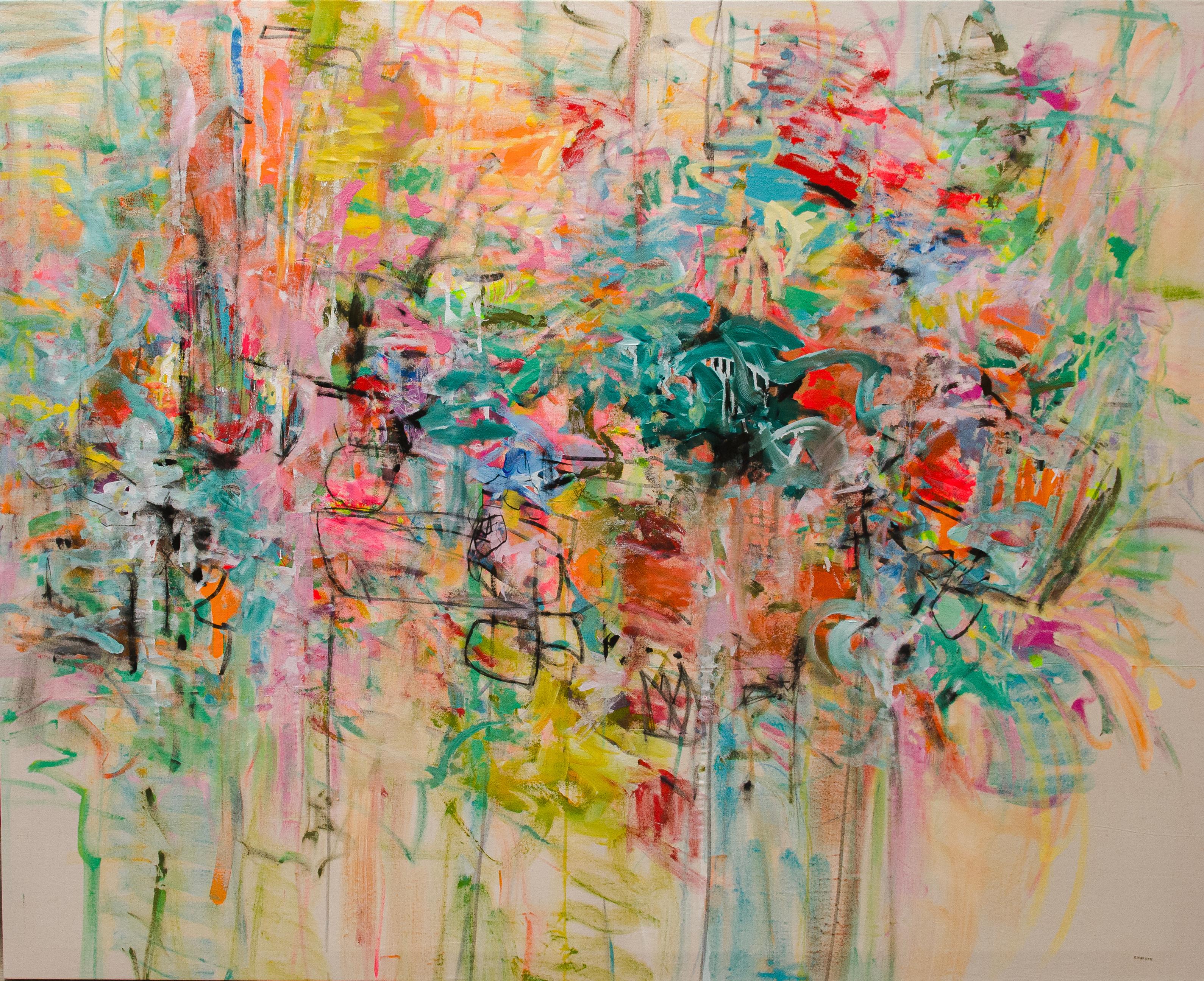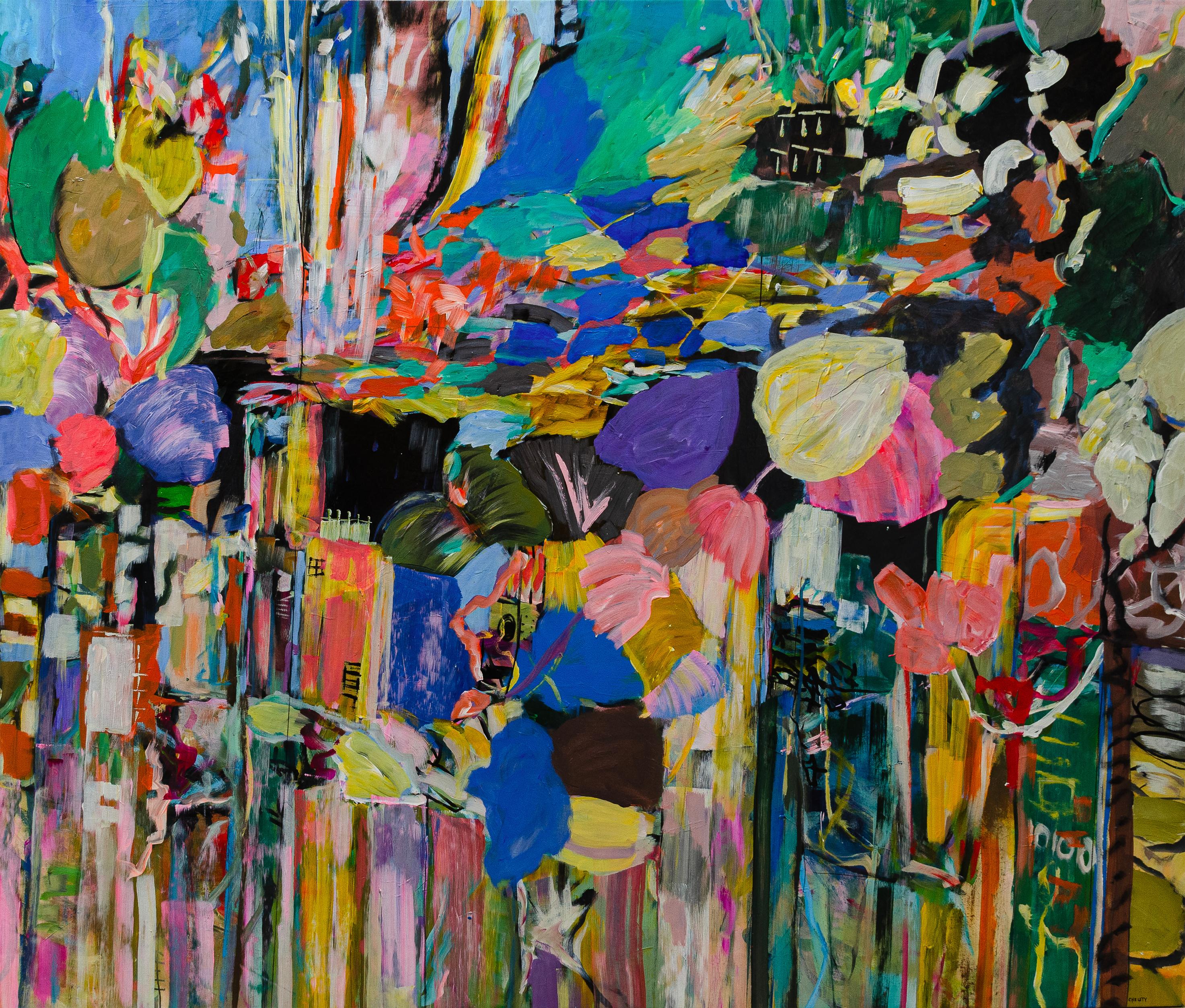 By Dual Acrylic, aerosol, tape and varnish on linen
