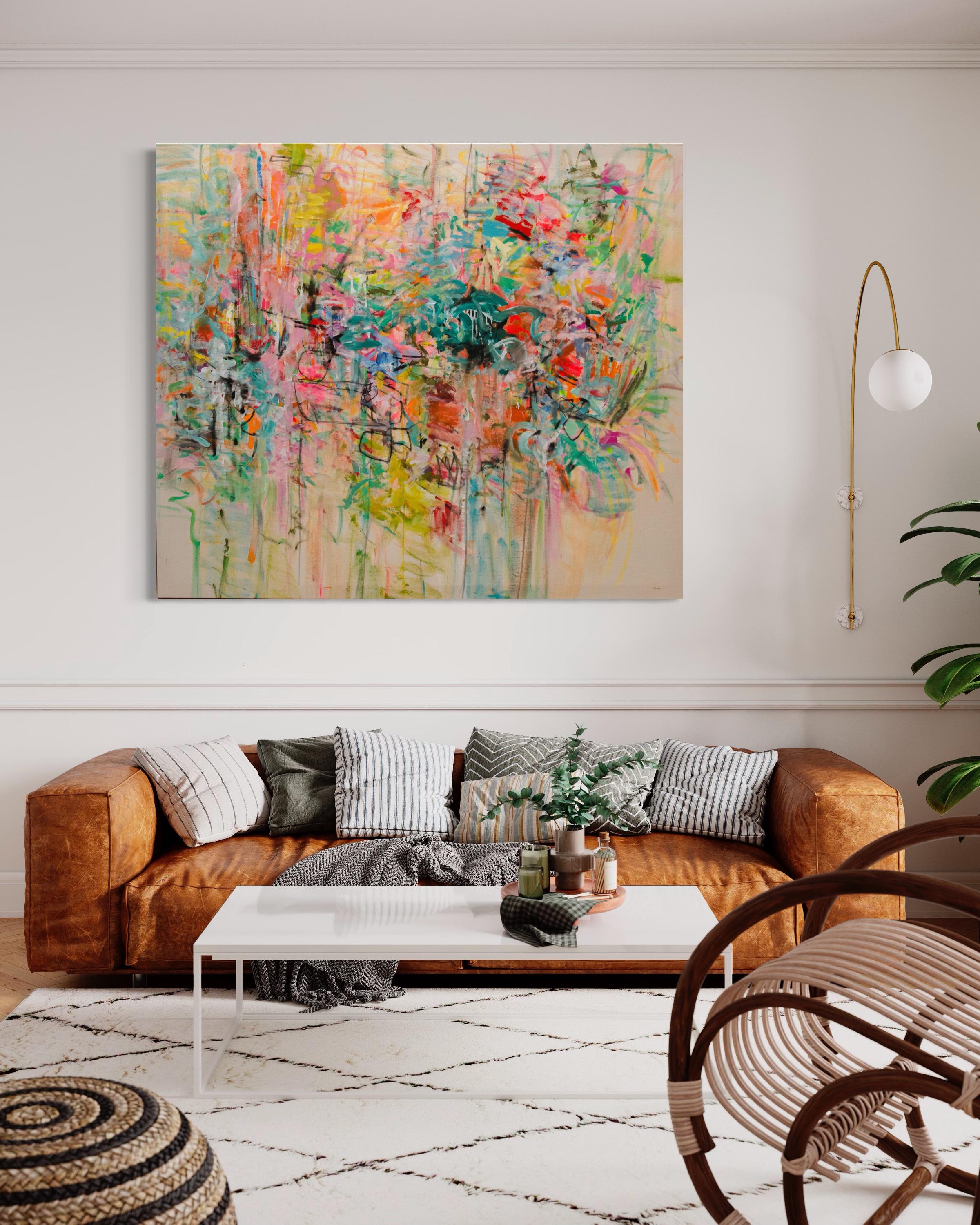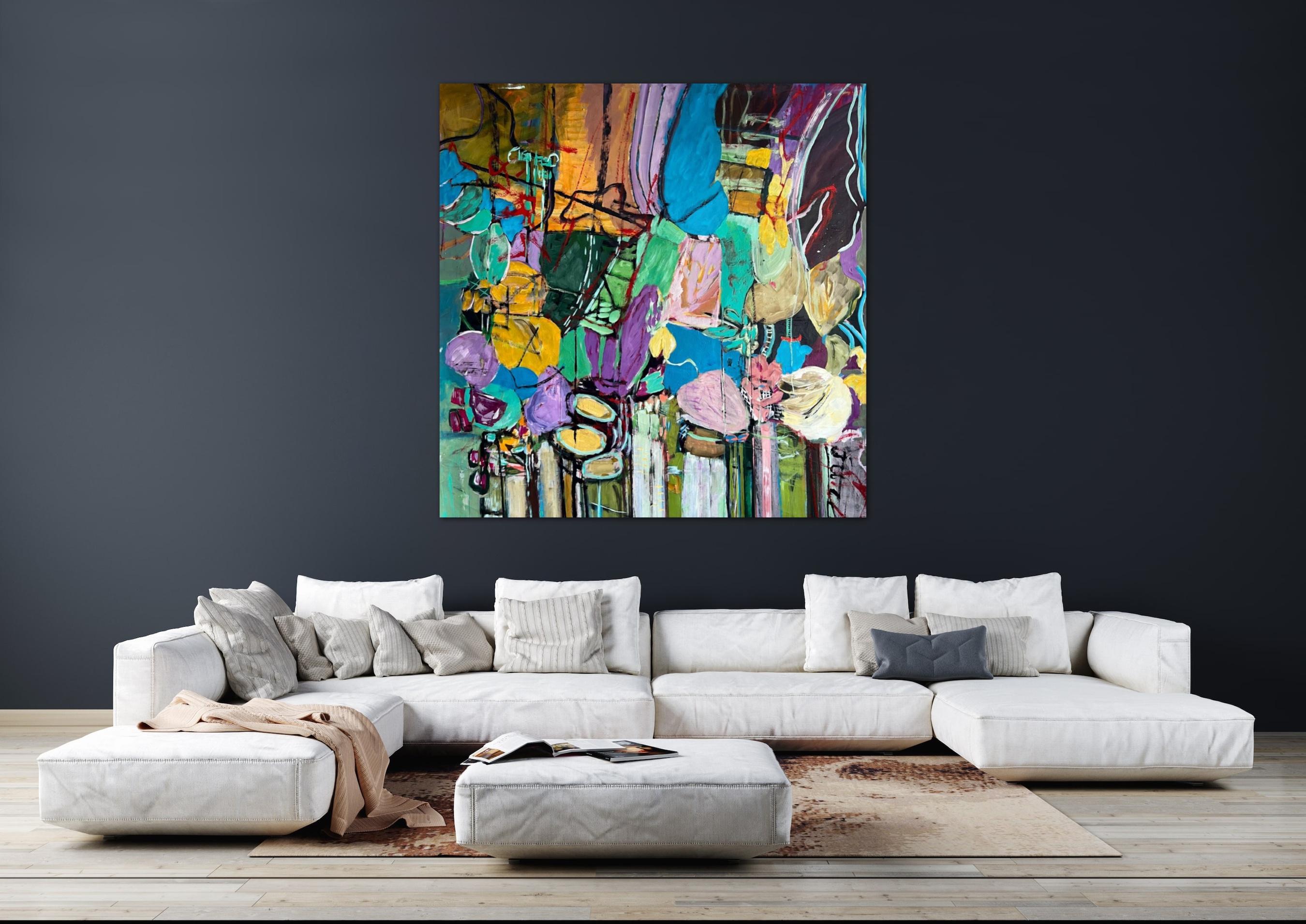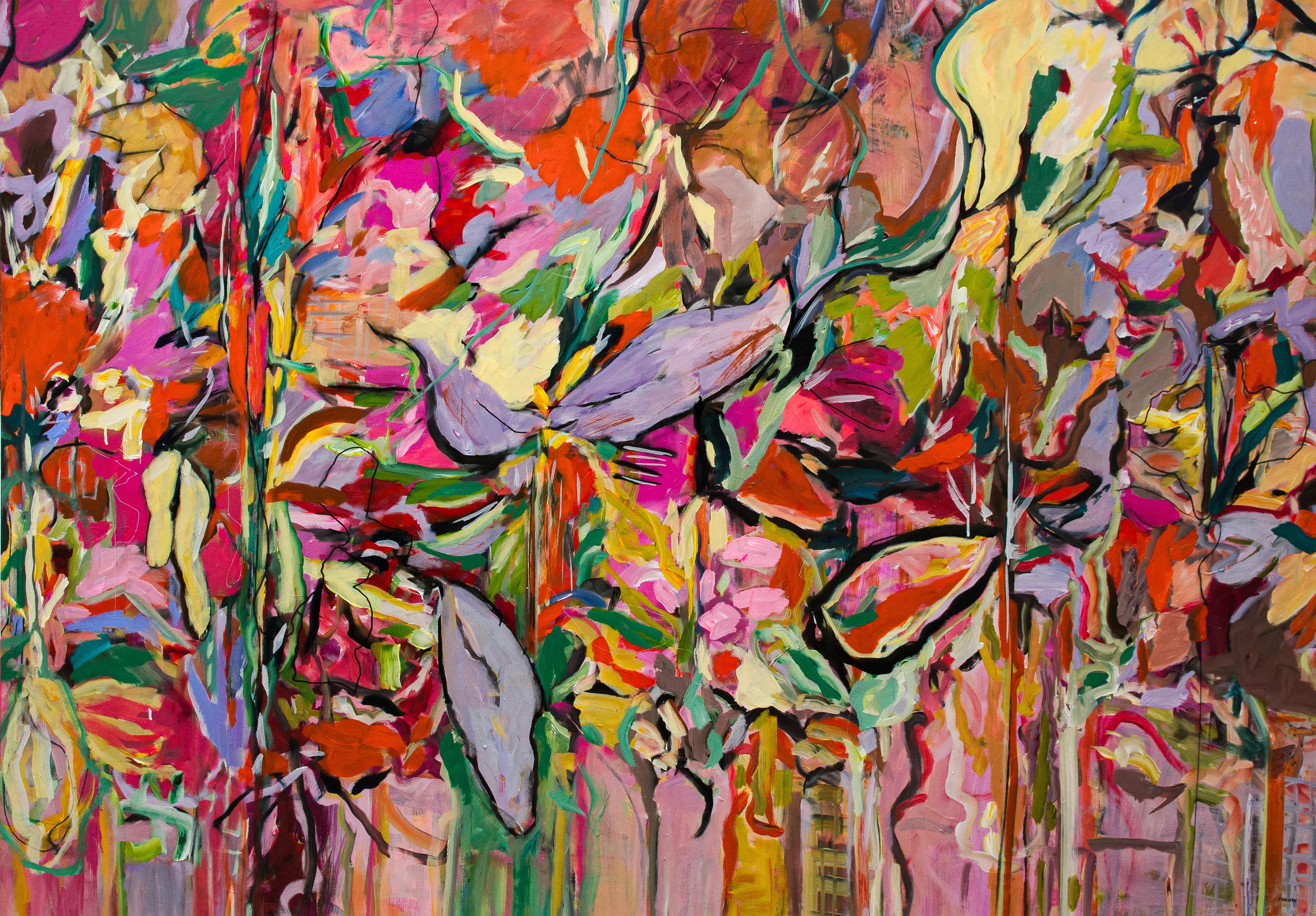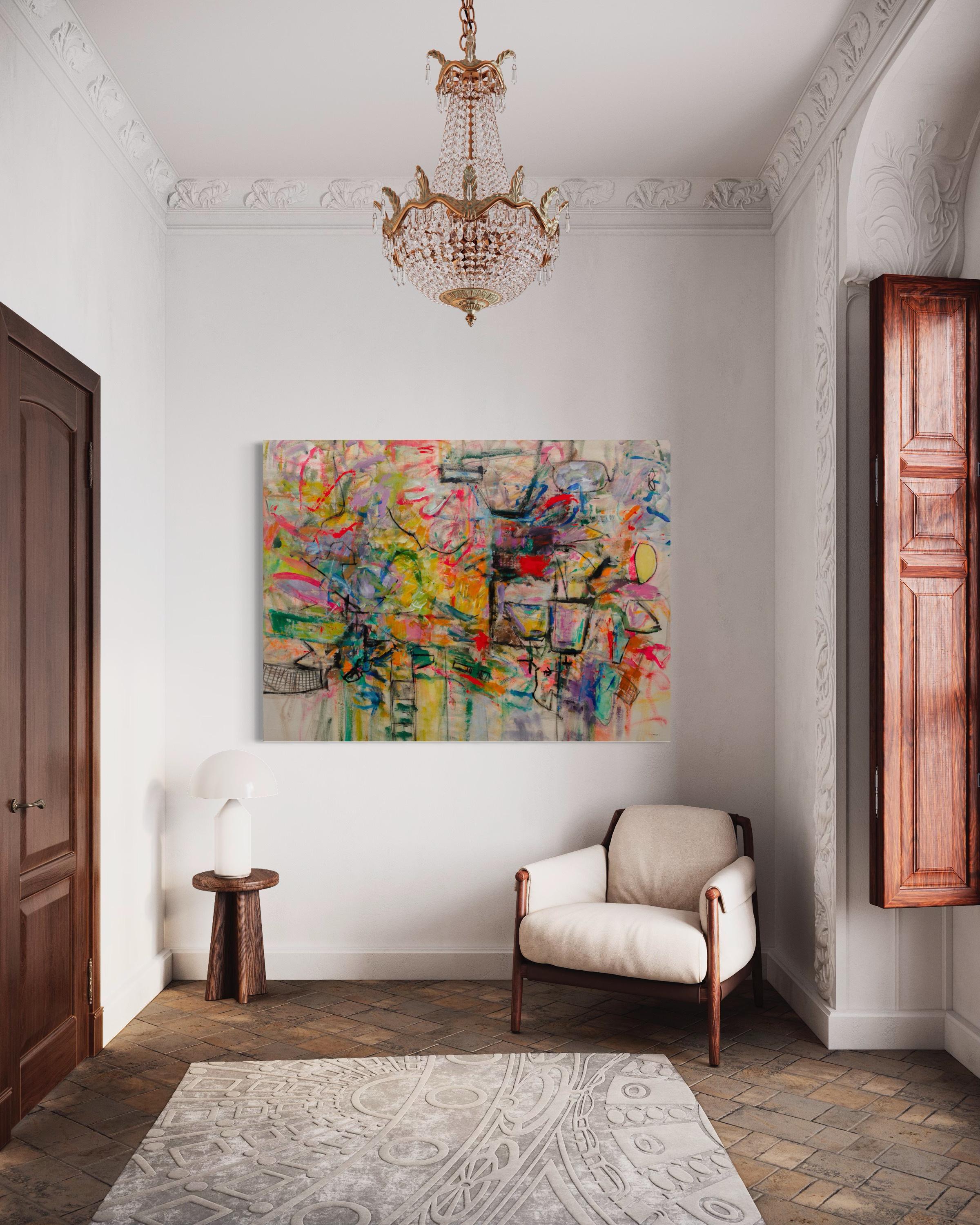 By Dual Acrylic, aerosol, tape and varnish on linen