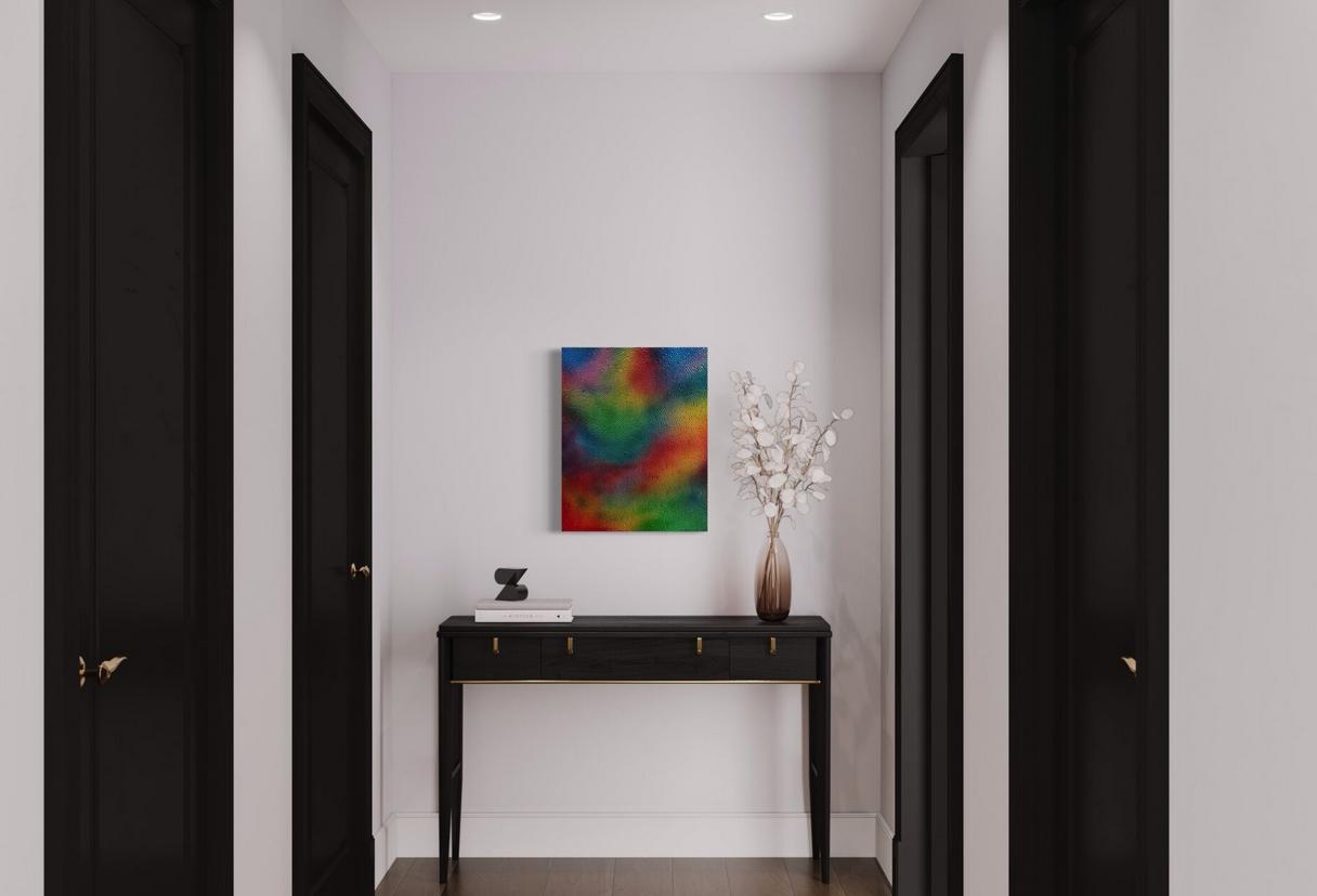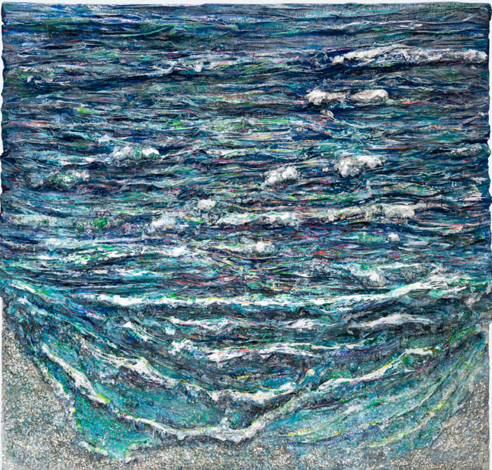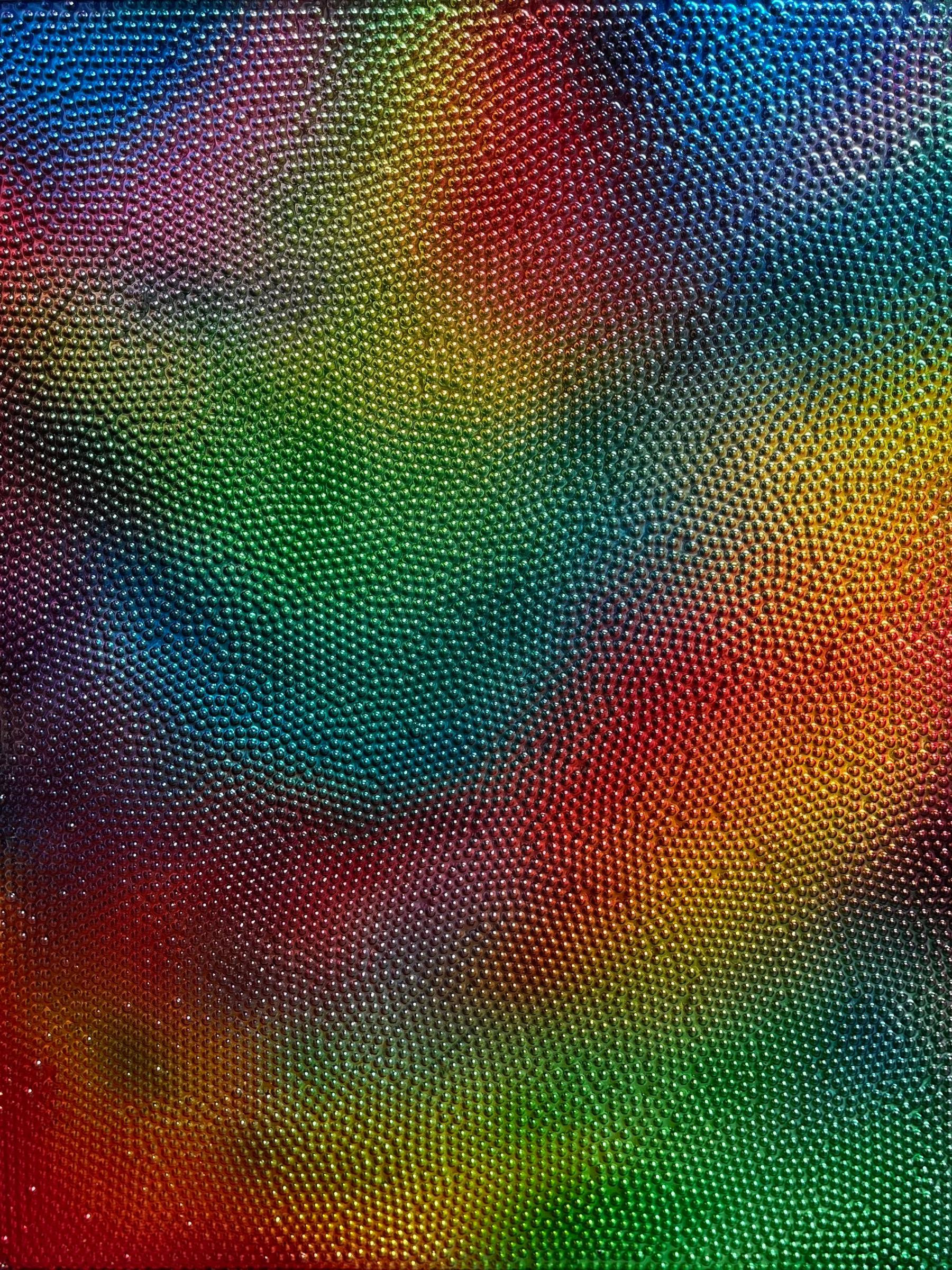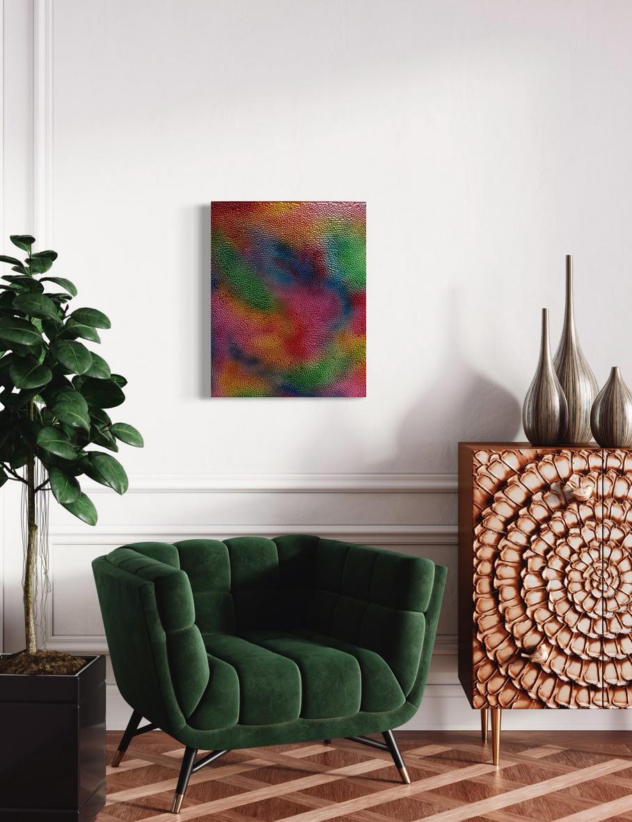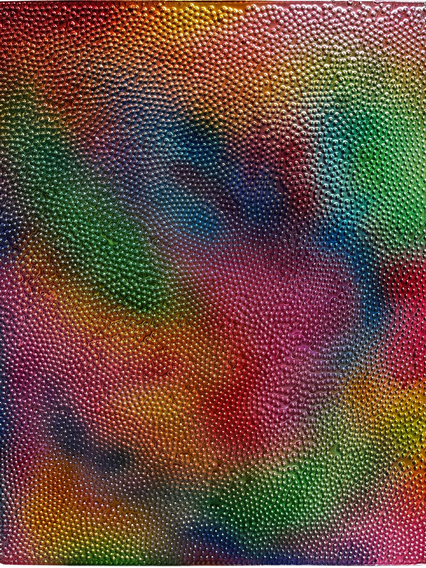 Canvas over artist made panel with epoxy, poly primer, silver deposit, and candy color.