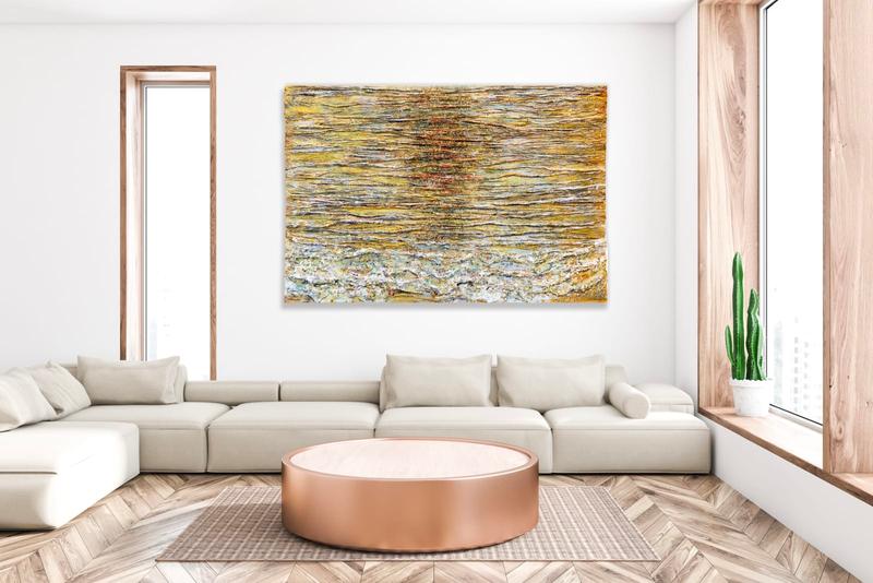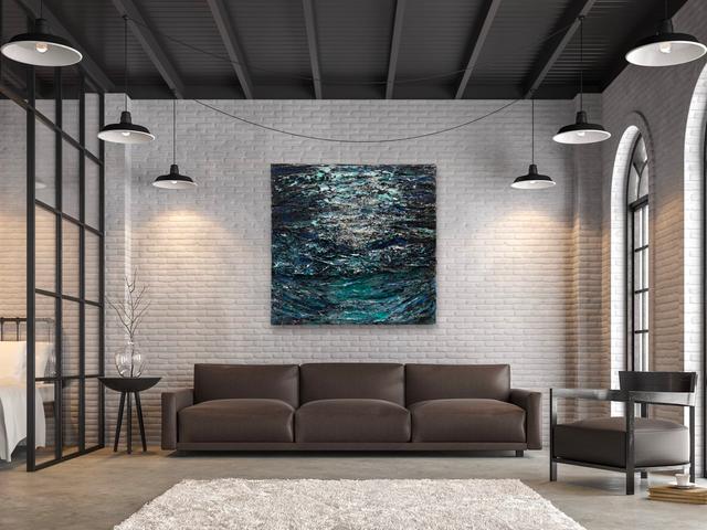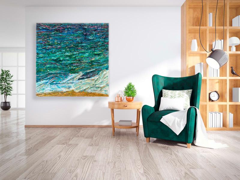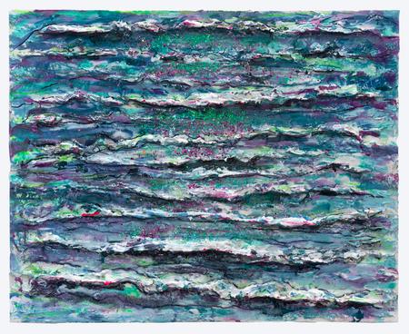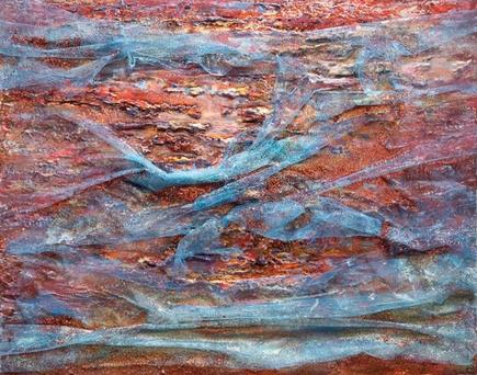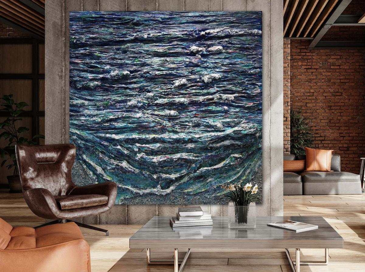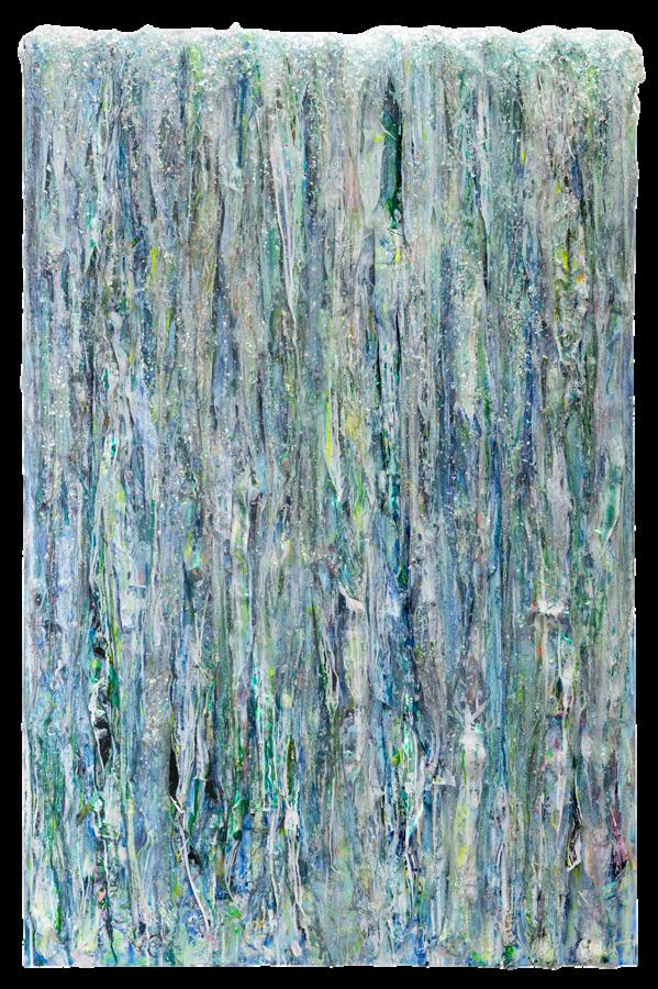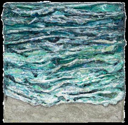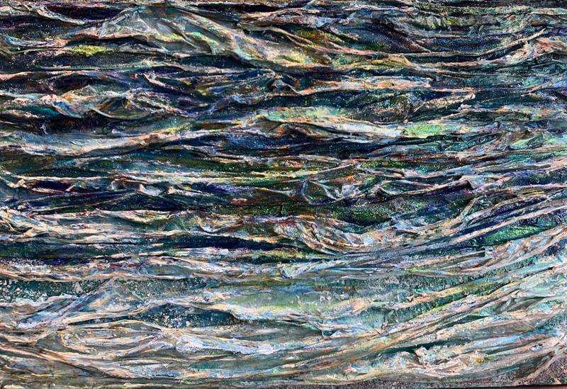 The Water Series explores the themes of water its torrents and stillness, its ebbs and flows, its shimmer and depth, its roughness and ripples. Through the use of a myriad of materials and textures, the paintings portray water as a cleansing, an immersive substance that both washes away our detritus and calms our senses with its rejuvenating and constant momentum. In this way, water is both substance and solution carries and cleanses the body and soul