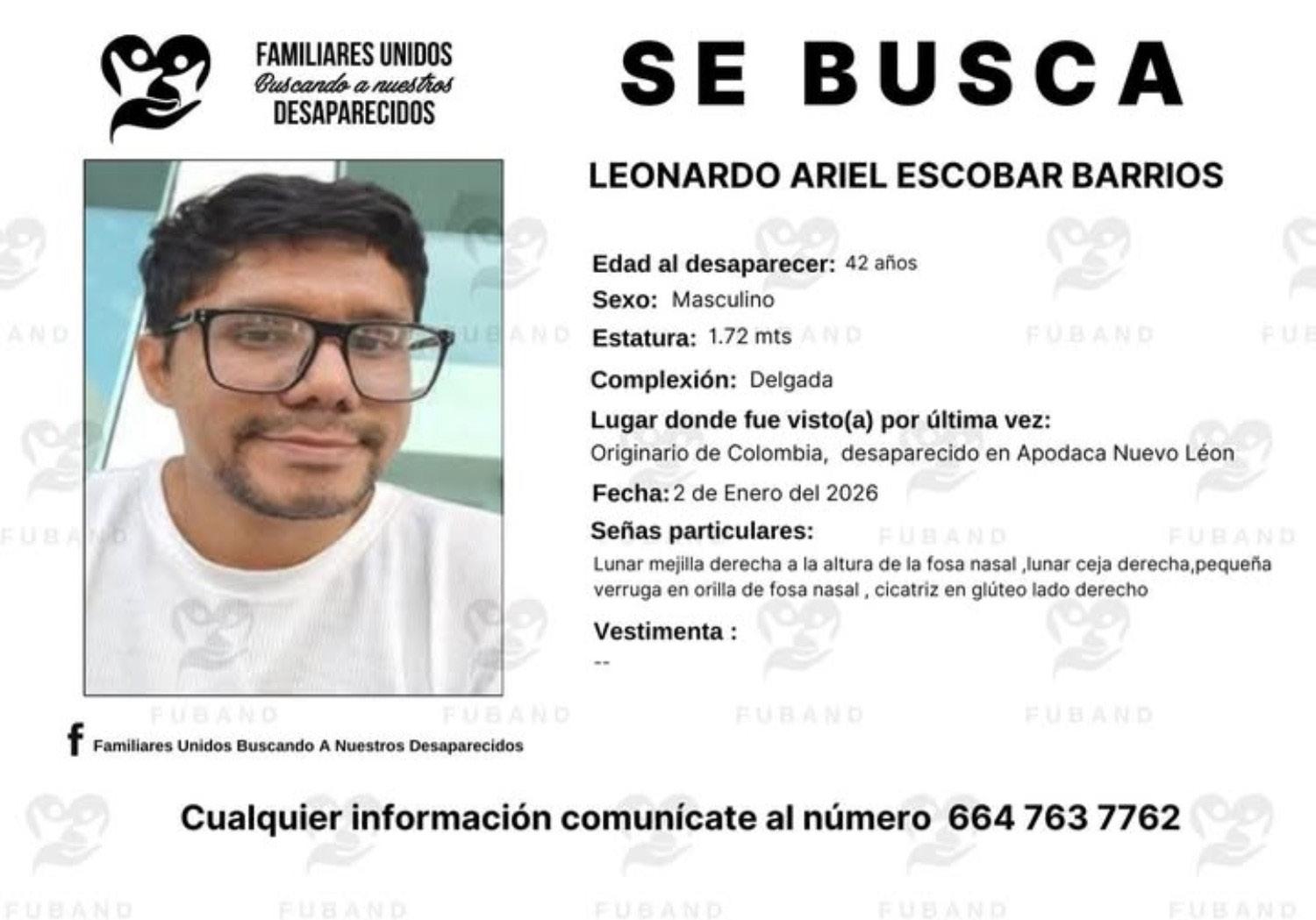 La desaparición del profesor colombiano Leonardo Ariel Escobar ha encendido las alarmas en México y Colombia, tras conocerse que fue visto por última vez la mañana del 2 de enero en inmediaciones del aeropuerto de Monterrey, en el municipio de Apodaca.