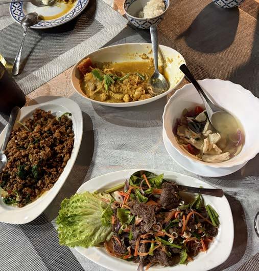 La comida tailandesa es muy variada y de gran sabor. La carne de pollo y cerdo, más las verduras, son esenciales. Los platillos se sirven al centro y cada uno toma la cantidad que desea. El arroz es infaltable. En la imagen hay cuatro platillos: a la izquierda es pad kra pao, como un picadillo. En la parte superior curry tailandés con pollo. A la derecha caldo de pollo con jengibre. Abajo carne de cerdo con legumbres. Imagen: Jaime Villasana Dávila.