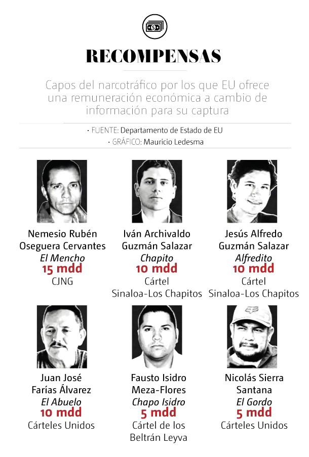 La lista de buscados se completa con otros miembros de alto perfil del crimen organizado mexicano, entre ellos Fausto Isidro Meza-Flores, ‘Chapo Isidro’; Nicolás Sierra Santana, ‘El Gordo’; Johnny Hurtado Olascoaga, ‘El Pez’; y Juan José Esparragoza Martínez, ‘El Azul’, entre otros. Las recompensas por estos objetivos van de tres a cinco millones de dólares.