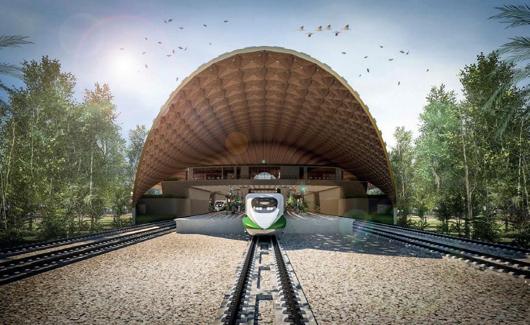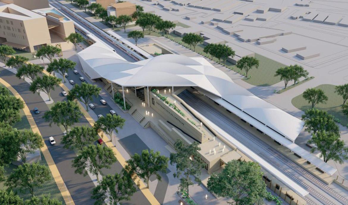 e iluminación con elementos culturales locales. El tren se integra con el sistema de movilidad regional que incluye el Tren Maya, autobuses urbanos y semáforos inteligentes.