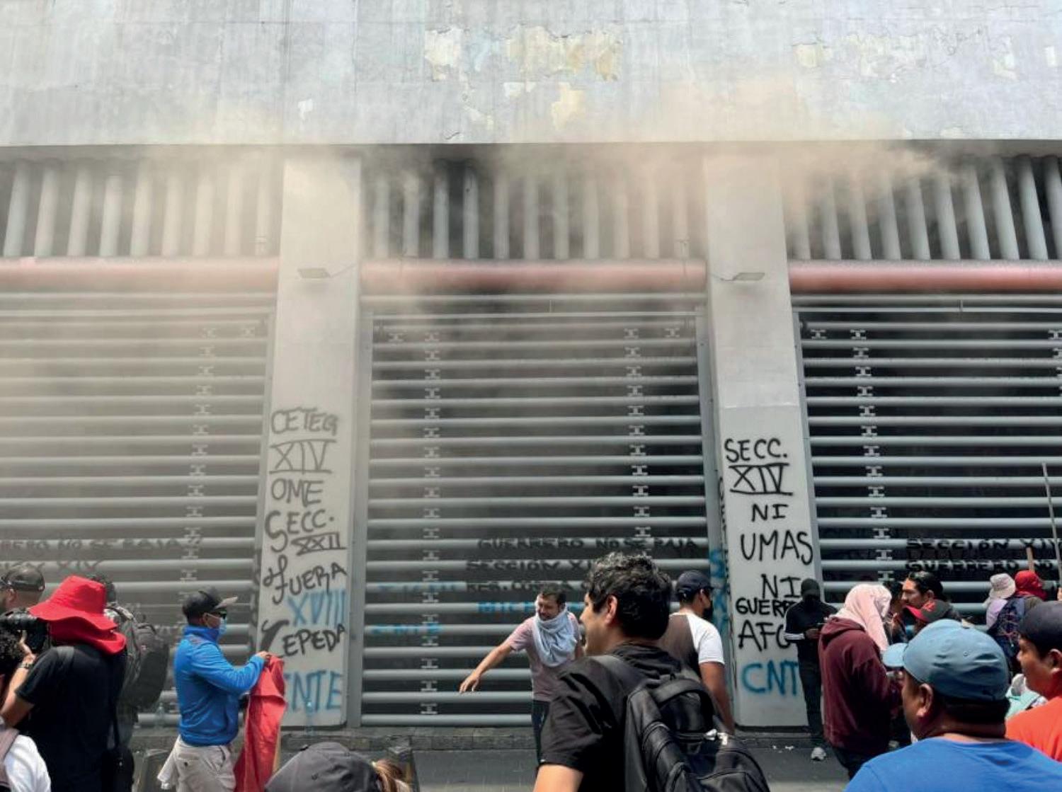 Ayer subió el tono. Mientras representantes de la Coordinadora “negociaban” con Rosa Icela Rodríguez, secretaria de Gobernación, y Mario Delgado, titular de Educación, los “maestros” de Guerrero intentaron romper con un marro una de las puertas del inmueble de Bucareli. El grupo, denunciado como “infiltrado” por los propios maestros de la CNTE, fue repelido con extintores por agentes de seguridad encargados de resguardar el inmueble.