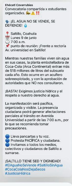 Con el lema “el agua no se vende, se defiende”, comenzó a circular una publicación en redes sociales convocando a la ciudadanía a manifestarse por la defensa del agua el próximo lunes 9 de junio, iniciará a las 7 de la mañana y será la rectoría de la Universidad Autónoma de Coahuila (UAdeC) el punto de reunión. La invitación fue por parte de estudiantes comprometidos, según información. Esta manifestación se dice ser pacífica, organizada y visible, en donde el propósito es exigir justicia hídrica y el respeto al derecho al agua.