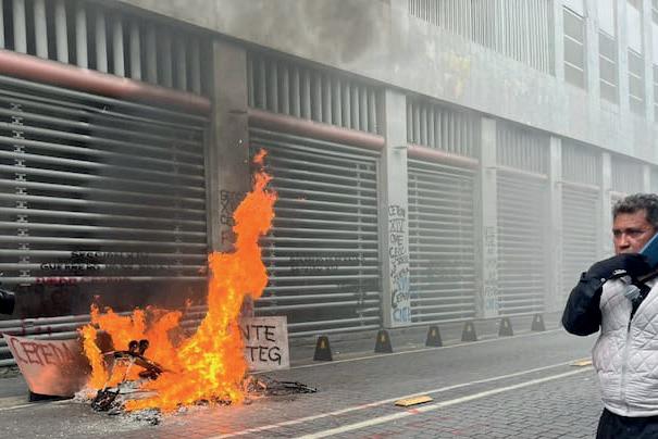 Poco después, a las 13:40 horas, el nivel de la protesta se intensificó cuando un grupo de personas que aún permanecía dentro del inmueble prendió fuego a parte del mobiliario. El incendio se propagó rápidamen-