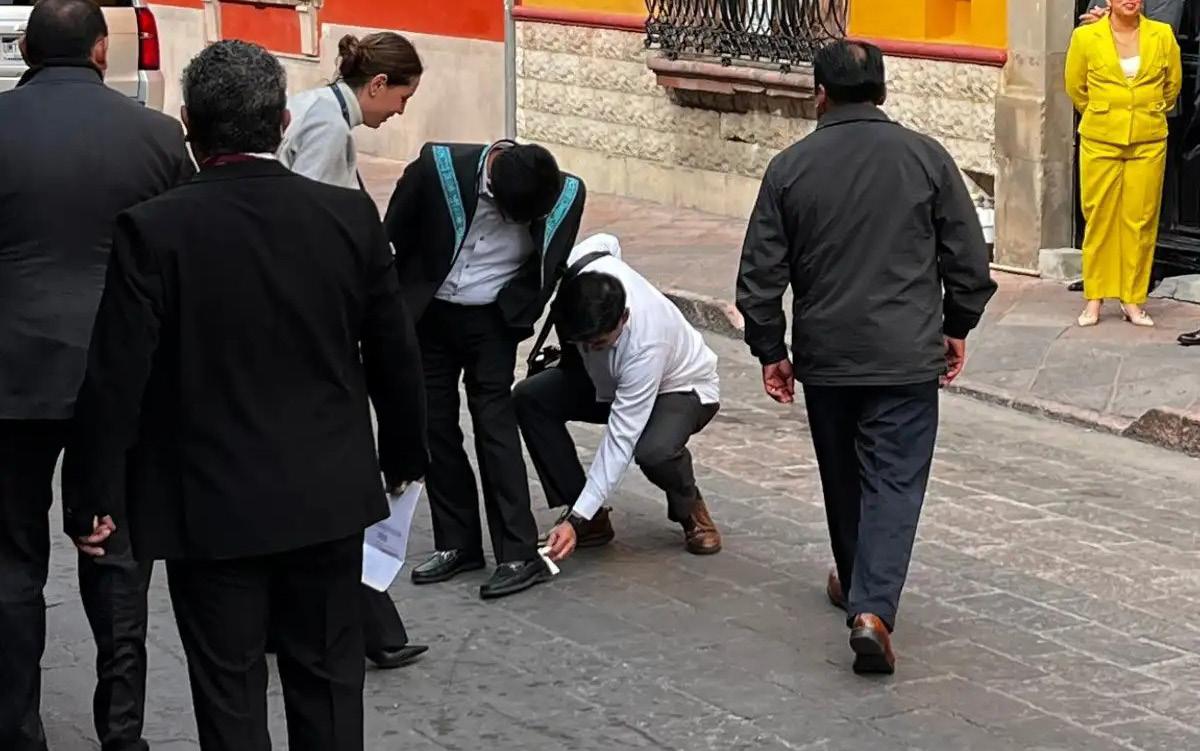 acto por el aniversario de la Constitución de 1917 en el Teatro de la República de Querétaro, muestran al magistrado de pie mientras una mujer –identificada posteriormente como Amanda Pérez, directora de Comunicación Social del tribunal– se agacha para limpiar el calzado del funcionario. Segundos después, otra persona, esta vez un hombre, repite la acción de limpiar el zapato.
