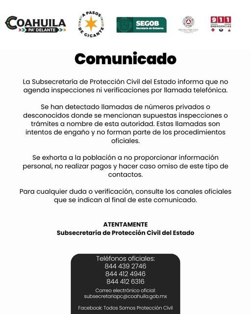 do publicado en redes sociales oficiales, la autoridad estatal precisó que su personal no agenda inspecciones ni verificaciones por vía telefónica, luego de identificar llamadas provenientes de números privados o desconocidos en las que se mencionan supuestos trámites o revisiones a nombre de Protección Civil.