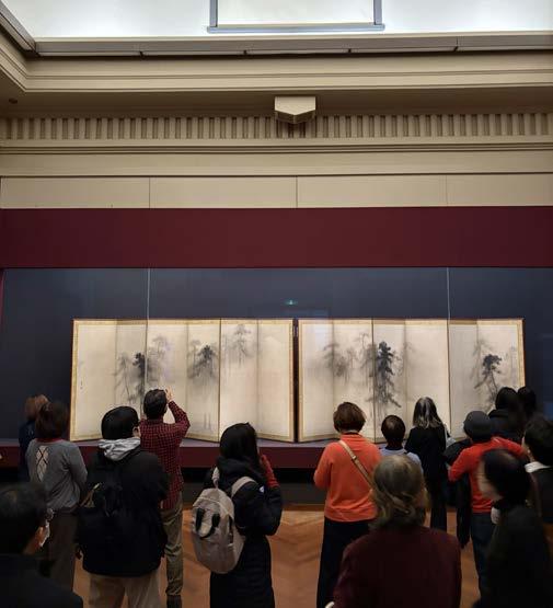 Personas apreciando la pintura “Pinos” del artista japonés Hasegawa Tohaku, elaborada en el siglo XVI. Esta pintura se exhibe ocasionalmente en el Museo Nacional de Tokio y es considerada patrimonio nacional. Imagen: Jaime Villasana Dávila.