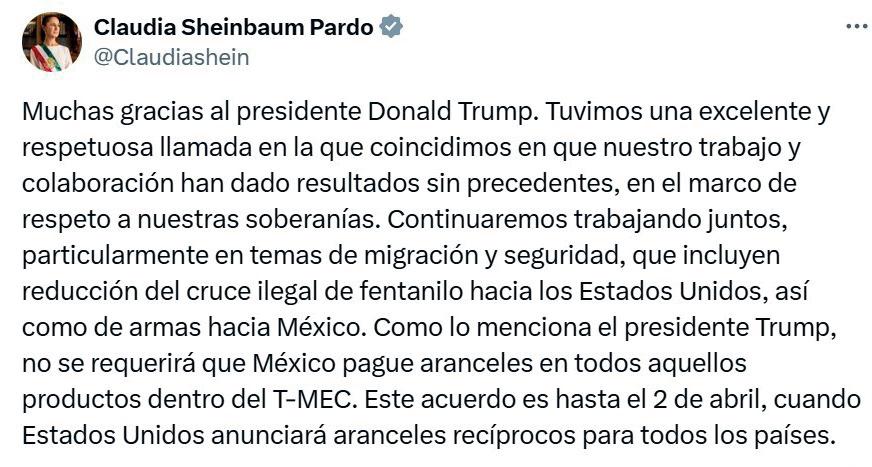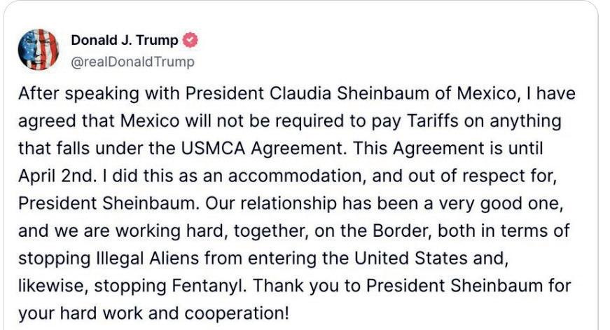 Claudia Sheinbaum de México, hemos acordado que México no tendrá que pagar aranceles sobre cualquier cosa que esté bajo el acuerdo T-MEC. Esto será válido hasta el 2 de abril”.