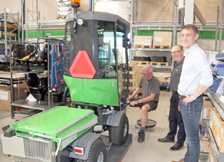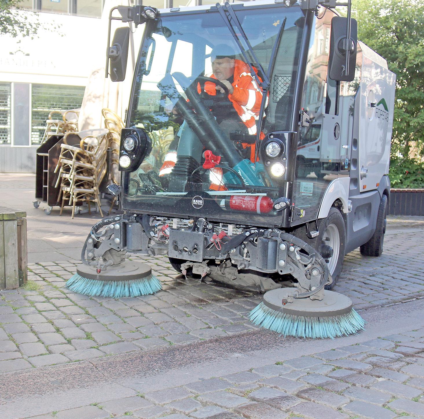 “Den er for stor til fortove, men passer helt perfekt til gågader, cykelstier og mindre lokationer. Og den kommer lynhurtigt rundt. Maskinen er sat til en maksimal hastighed på 35-40 km/t. Batteriet har kapacitet til seks-syv timer i den daglige drift, og det rækker jo fint”, siger Søren Eskelund.