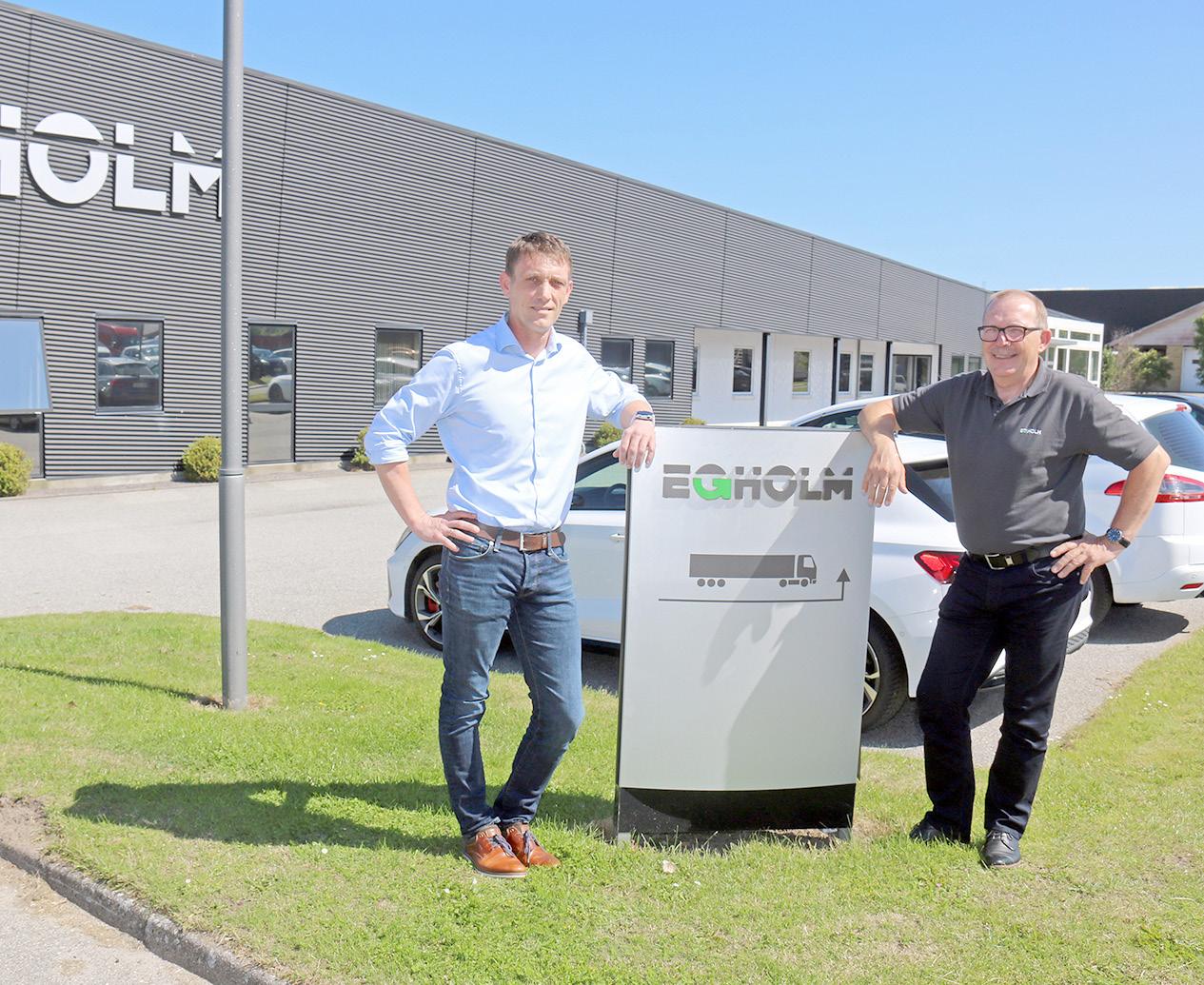 for Norden, Henrik Munk (til venstre) og hans efterfølger, Jan Lysholt, foran virksomheden på Transportvej i Lemvig.