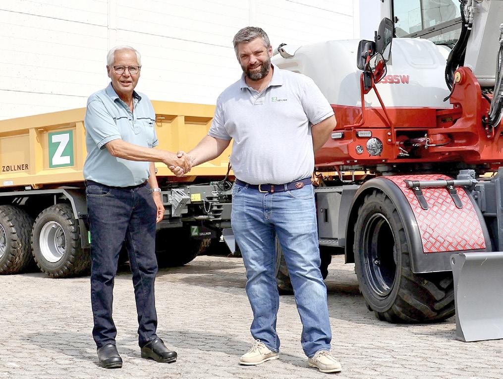Maskinhandler Carl Bay Christensen og entreprenør Karl Johan Zøllner giver hånd på det store indkøb.