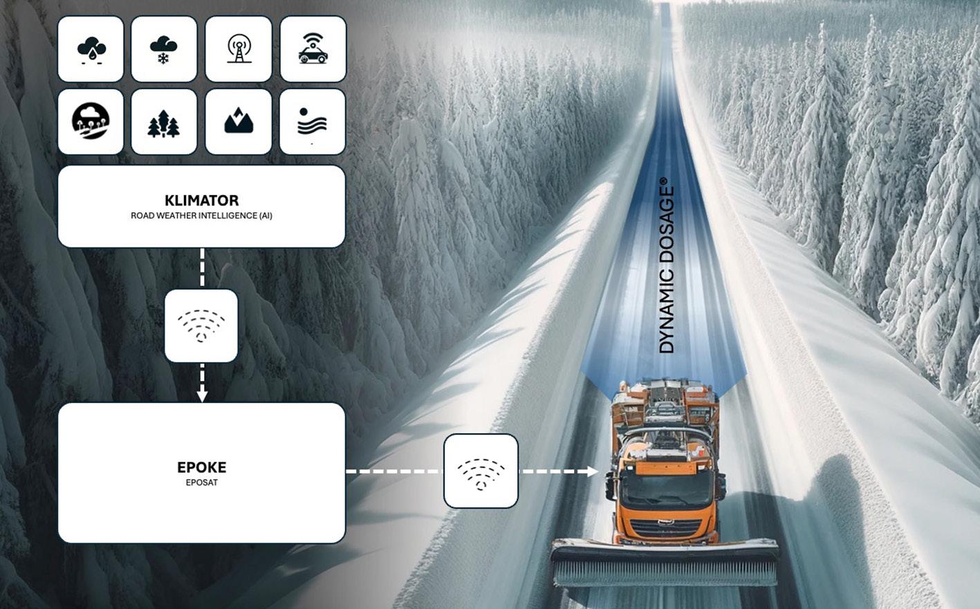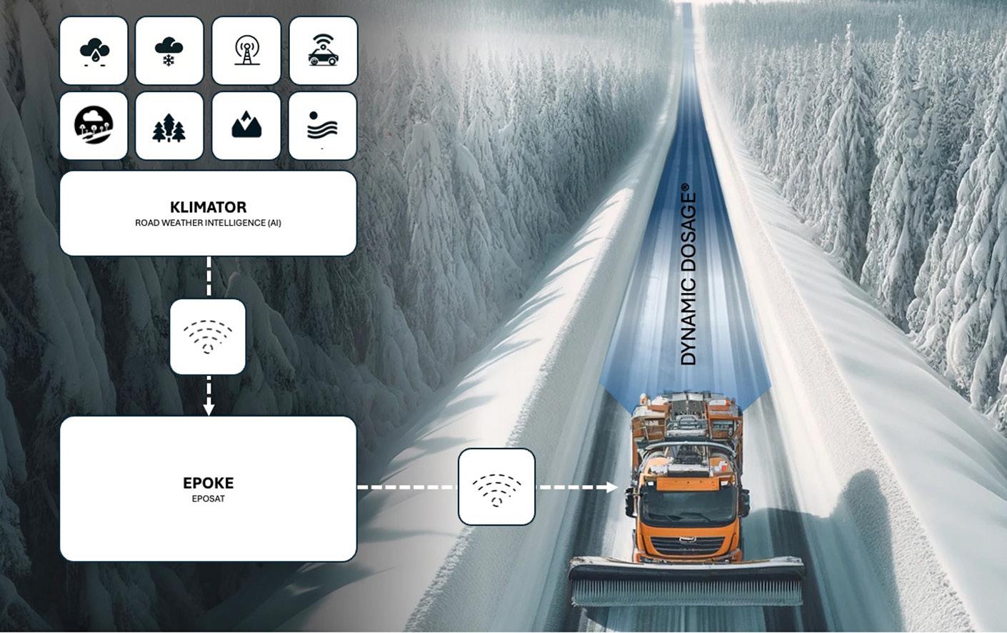 løsninger, fordi vores spredeprogram er forberedt til dynamisk dosering med vores EpoThermløsning. Ved at overføre vejtilstandsprognosen til vores EpoSat-ruter var vi i stand til at styre sprederne fuldstændig dynamisk ud fra den vejtilstandsprognose, som Klimator leverer på samme måde. Vi har implementeret det fuldt ud i løbet af vinteren og er stolte over at kunne præsentere denne verdensnyhed for dynamisk dosering af salt til vinteren i hele verden”, siger Epoke-direktør Peter Bertelsen.