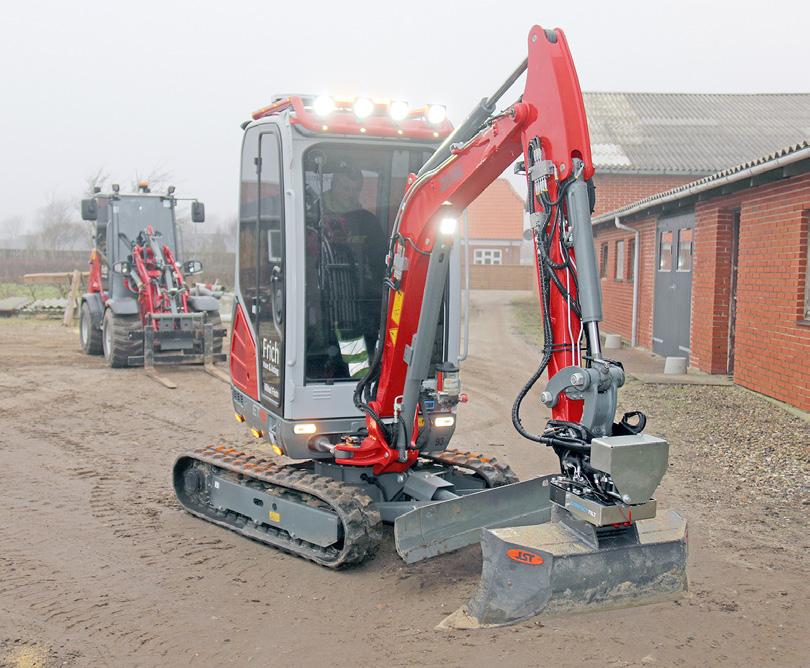 Den nye i maskinparken er en Wacker Neuson ET18 graver, som salgskonsulent Peter Røjkjær hos Stemas A/S har leveret med en kampvægt omkring de to tons. Men Mikkel Frichs maskine er langt fra standardudgaven. Pedalerne i bunden er afmonteret, og alle funktioner er flyttet op i joysticks. Maskinen har masser af ekstra arbejdslys, men også positionslys i forskellige farver både foroven og forneden. Inde i kabinen har Mikkel Frich et behageligt rødt lys. Og så har graveren også blitz-blink. Det har mekaniker Peter Hvass på Stemas’ værksted i Hadsten haft fingrene i, så Mikkel Frich nu kan ændre blitz-frekvensen ved tryk på en knap i kabinen. Foruden en lang række standardfeatures, som maskinen er født med, har den tillige fået centralsmøring, og Stemas har leveret den med både Compacttilt, Moba-maskinstyring og skovle fra maskinfabrikken JST.