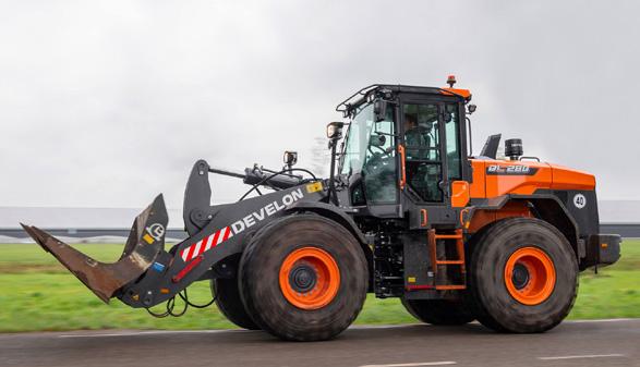 på en tur rundt i landet for at demonstrere 15,5 tons gummihjulslæsseren DL280-7. Develons læsser-segment spænder fra den lille kompaktlæsser DL60-7 på lidt under 4 tons over maskiner i 16 forskellige størrelser til den 35 tons tunge DL580-7.