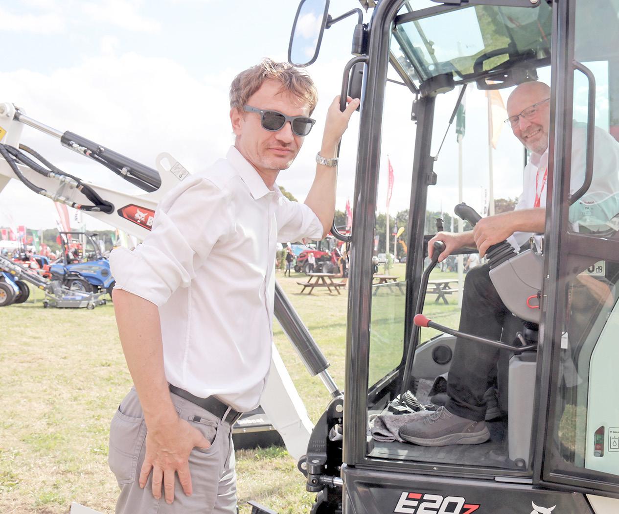 Den danske Bobcat-importør, Stenderup A/S, skruede lidt op på charme-knappen på Ledreborg, hvor den nye Bobcat-serie blev til en verdensnyhed. Det var det også i Have & Landskab-relation, men den reelle verdenslancering skete faktisk på Bauma i april. Her sidder salgskonsulent Finn Pallesen i døråbningen og har selskab af Bobcat-produktmanager Miroslav Konas.