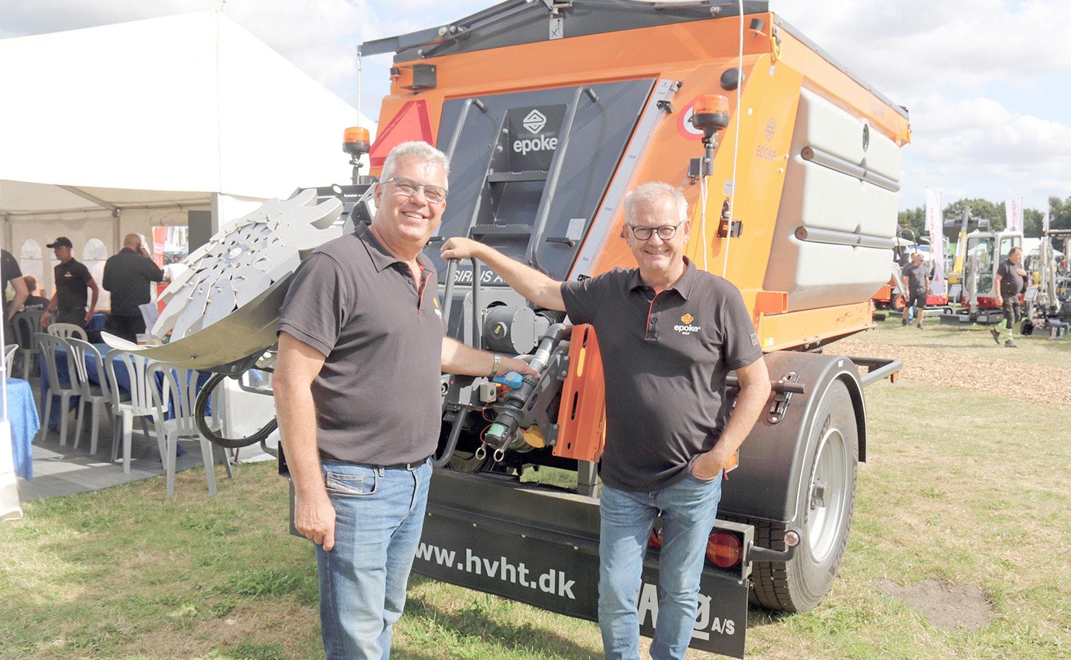 Epoke-salgsfolk i sommerligt outfit. Kurt Søgaard Antonsen (til venstre) og John Overgaard Jensen nød solen og 24 grader ved Ledreborg, mens de solgte materiel til sne og is. Her med en Sirius AST-spreder, som fortsatte direkte fra Have & Landskab til kunden.