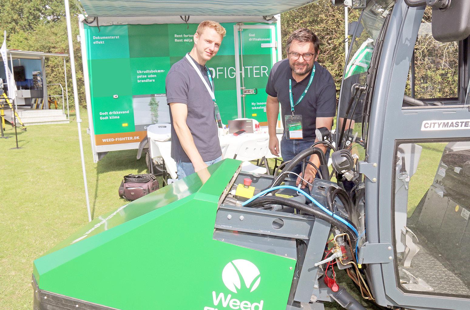 WeedFighters projektleder Emil Madsen ser til, mens direktør Jens Bruun Skifter har fingrene i mekanikken.