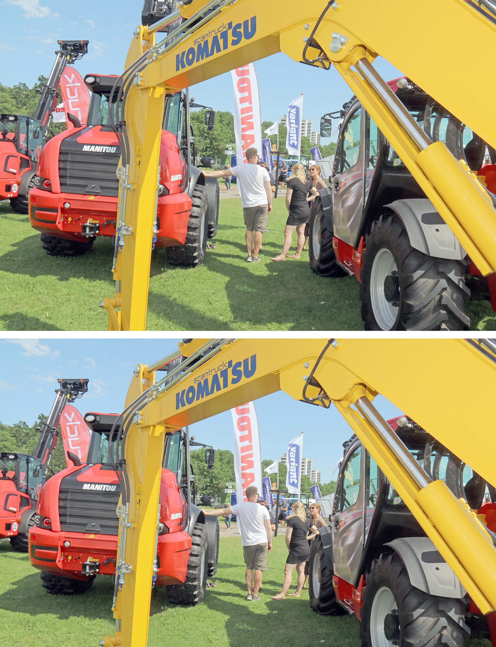 Er det gule fejl – eller røde fejl? Komatsu eller Manitou? Begge dele er mulige, men det kan også tænkes, at der slet ingen fejl er ved maskinerne, men derimod rundt omkring i omgivelserne. Under alle omstændigheder: Der er 5 af dem – fejl.