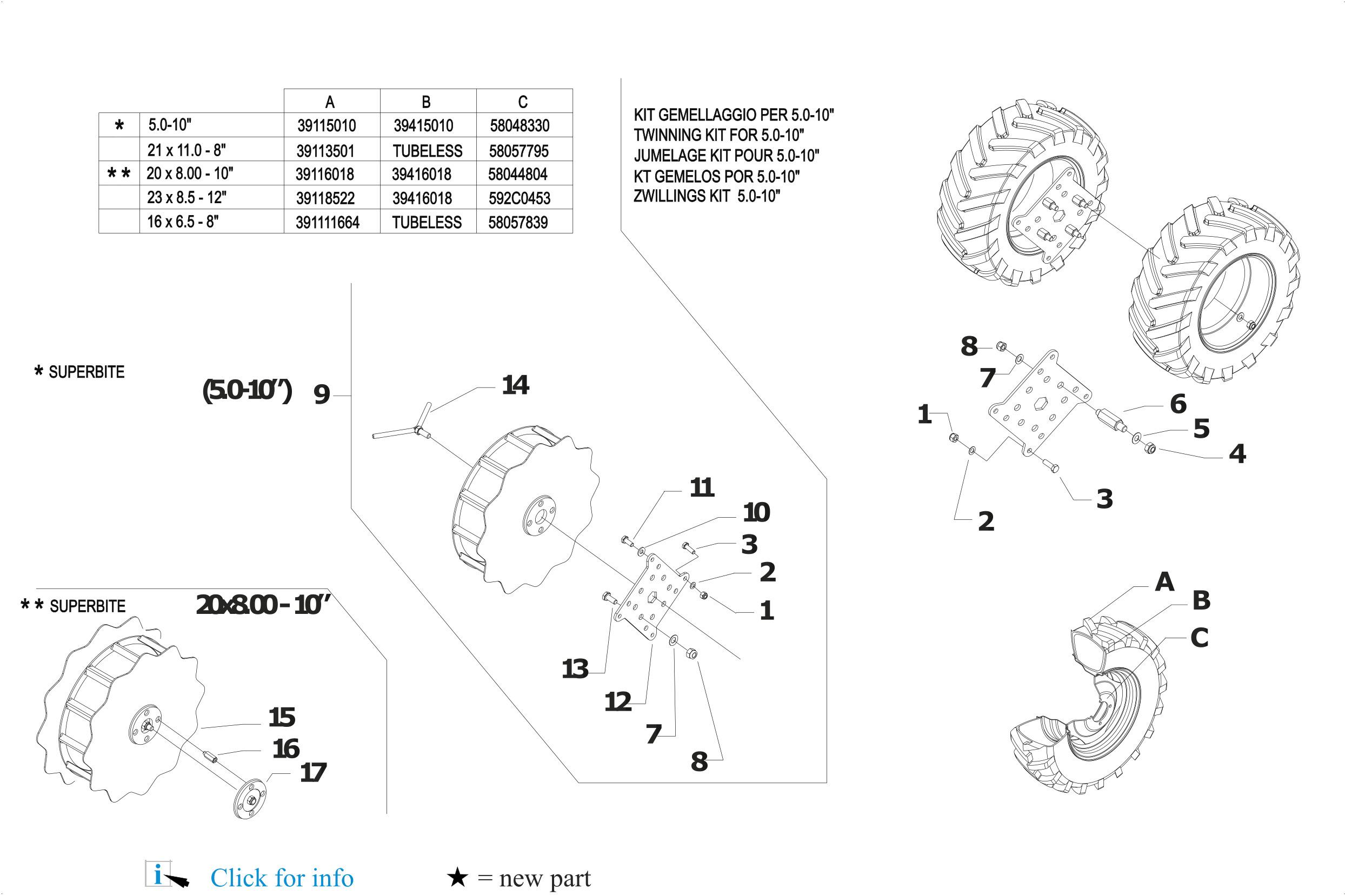 R.01.02.A0041_00 - WHEELS 03/02/2023 Page 49 / 49 Pos. Id Q.ty Description Note 1 31241080 HEXAGON SELFLOCK NUT M8 2 31423084 SPRING WASHER 8,4 3 31112151 SCREW TE M8X25 UNI 5739 8G 4 31241100 SELFLOCK HEXAGON NUT M10 5 31423105 SPRING WASHER 10,5 6 56359554 PIN 7 31423130 SPRING WASHER EL 13 DIN 137-B 8 31241120 SELFLOCK NUT M12 9 59259555 SUPER-BITE WHEEL X 5.00-10 10 31421101 WASHER 10 DIN 679 11 31112219 SCREW TE M10X25 UNI 5739 12 59059551 FLANGE 13 56359553 PIN 14 59059561 SCREW 15 59259598 WHEEL 16 56359593 DRIVING PIN 17 59059591 SPACER