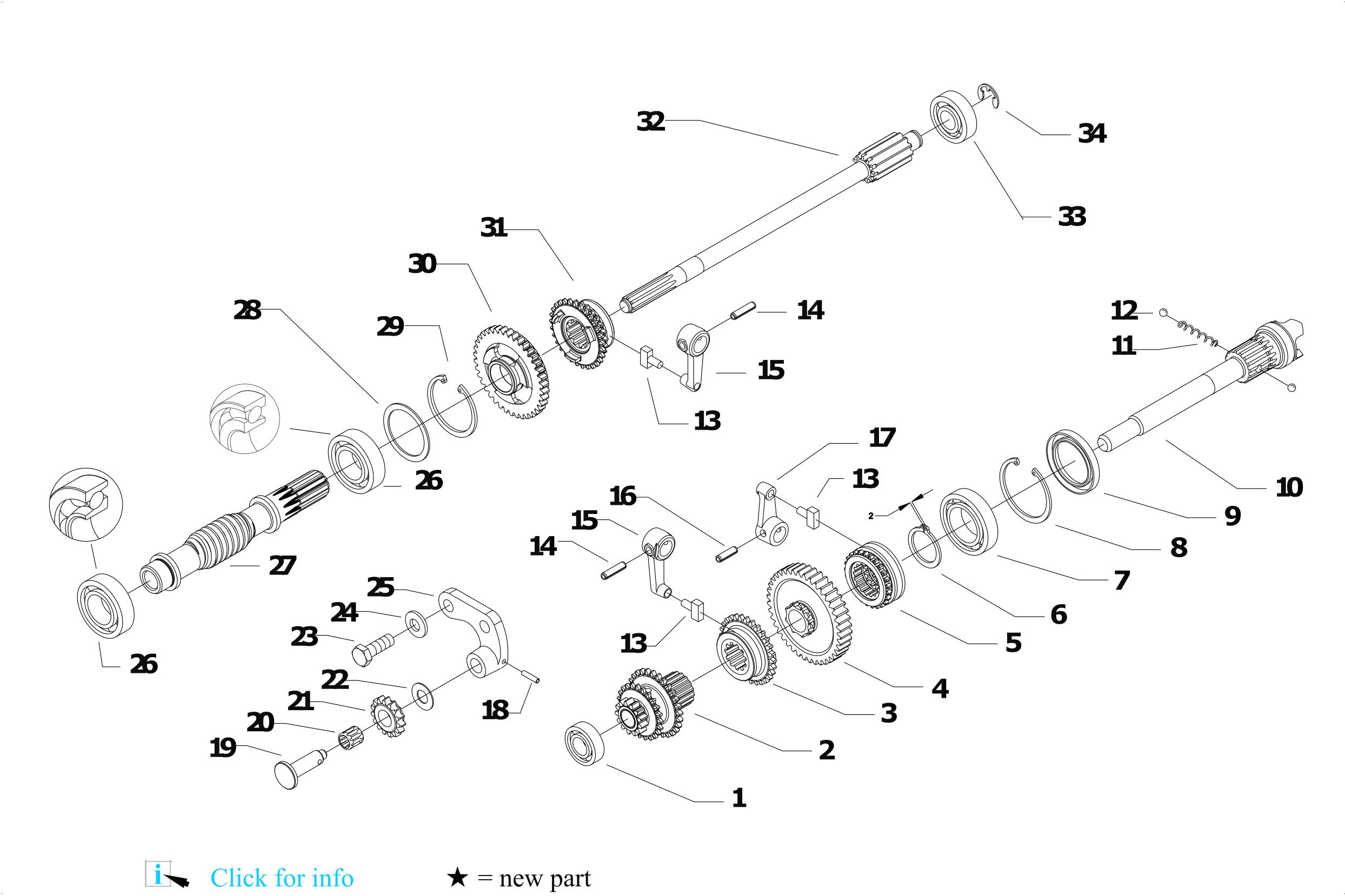 GEARS 03/02/2023 Page 25 / 49 Pos. Id Q.ty Description Note 28 56356330 ADJUSTING RING SP=1,7 28 56356331 ADJUSTING RING SP=1,8 29 35111052 SEEGER RING I 52 DIN 472 30 52456732 GEAR 1a 3C 31 52456733 SLIDING 3C 32 52456339 SHAFT 33 37111152 BEARING 6302 (15X42X13) SKF 34 35211120 SEEGER RING E 12 UNI 7434