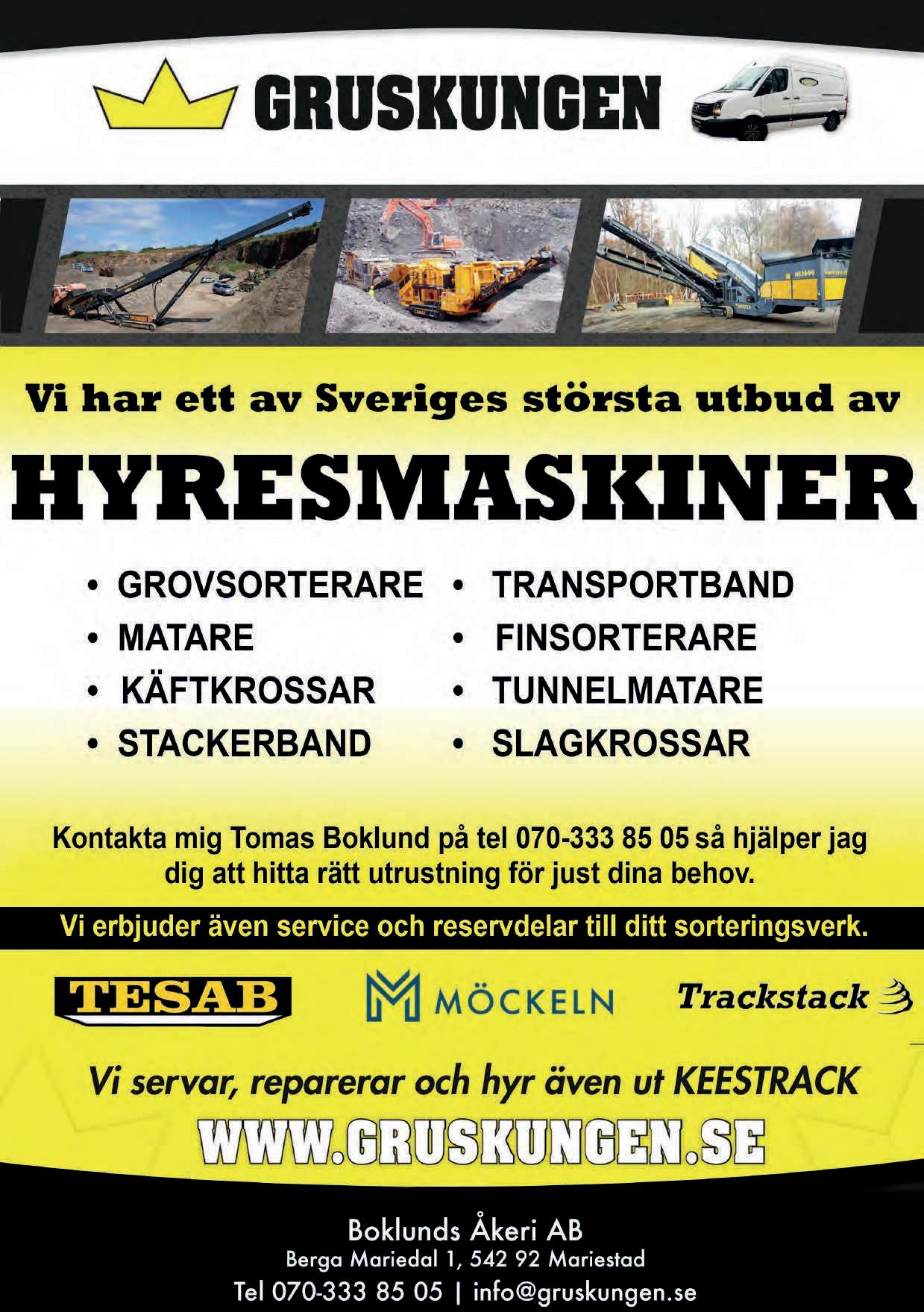 INDUSTRITVÄTTMASKINER Mindre tvättmaskiner i standardutförande till specialanpassade anläggningar. Tel 054-691990 • E-post: info@teijo.se www.teijo.se Tel 0611-214 40 www.frolenkross.se FRÖLÉN KROSS AB Berg- och gruskrossning med moderna, transportabla verk LENNART PETTERSSON GRUS & KROSSNING Tel 0470-77 30 81, 0470-77 30 40 www.lennartpeterssonsgrusochakeri.se GRUSARBETEN UTFÖRES BOKLUNDS ÅKERI AB Tel 070-333 8751 / 070-333 8771 www.gruskungen.se LST AB Tel 070 - 362 65 08 • www.lst-ab.se www.forarmiljo.se Specialisten på förarstolar och tillbehör TUNNELMATARE KROSSA SORTERA FLYTTA www.evorex.se Tel 0240-376 10 www.swemas.se FORDONSINREDNING Tel 0430-732 30 Kyla och värme till fordon Tel 0243-132 17 www.vbmaskiner.com Tel 0950 - 126 71 SHARKför hantering av biomassa Krossning - ÅtervinningSortering - Stackläggning Tel 010 - 16 61 244 www.akselbenzin.se Saknas ni här? Kontakta oss så fixar vi det: david@maskinkontakt.se Utrustning för sortering och materialhantering www.mockeln.com Systemet för naturlig och biologisk avfettning www.bio-circle.se Siktskopor för gräv- & lastmaskiner www.mttsweden.com EcoBale - ledande i Norden på BALTRÅD https://ecobale.com/sv/ Krossning, Sortering, Demolering, Återvinning, Grävning, Hantering Tel: 070-300 72 23 • www.unirox.se www.iqr.se Lösningar för industriell återvinning Lyftmagneter och metallseparatorer 0725 70 07 90 www.sweeptech.se Avancerad utrustning för väg, park & grönyta Tel 070-66 77 830 www.biocare.se 07 w Tel0 0 www ww 0722-77 22 77 www.scpartner.se Lyftmagneter och metallseparatorer ÅTERVINNING Tel 0171 - 48 74 00 www.amas.se www.iqr.se Lösningar för industriell återvinning Rivnings- och återvinningsutrustning www.andersen-contractor.se Tel: +46 70-242 56 26 E-mail: karlsson-l@telia.com Tel:+46702425626 Tel: +46 70-242 56 26 E-mail: karlsson-l@telia.com Tel:+46702425626