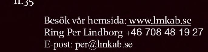 L I D P O L Karlstorpsvägen 15 531 57 Lidköping Tel: 0510-275 10 Lasse: 070-548 31 79 Albin: 070-295 90 51 www.lidpol.se Miljömotor Steg 5 på fabriksnya grävmaskiner och lastmaskiner Alla maskiner är CE-märkta Volvo original Utrustning på nya entreprenadmaskiner kan vid enstaka fall variera Volvo EC300El 400 tim 2022 Volvo L70H 320 tim 2022 Volvo ECR355EL 2 800 tim 2019 Volvo ECR235El 2022 Volvo EW160E 3 400 tim 2019 Volvo EW160E 2022 Volvo L180H fabriksny 2022