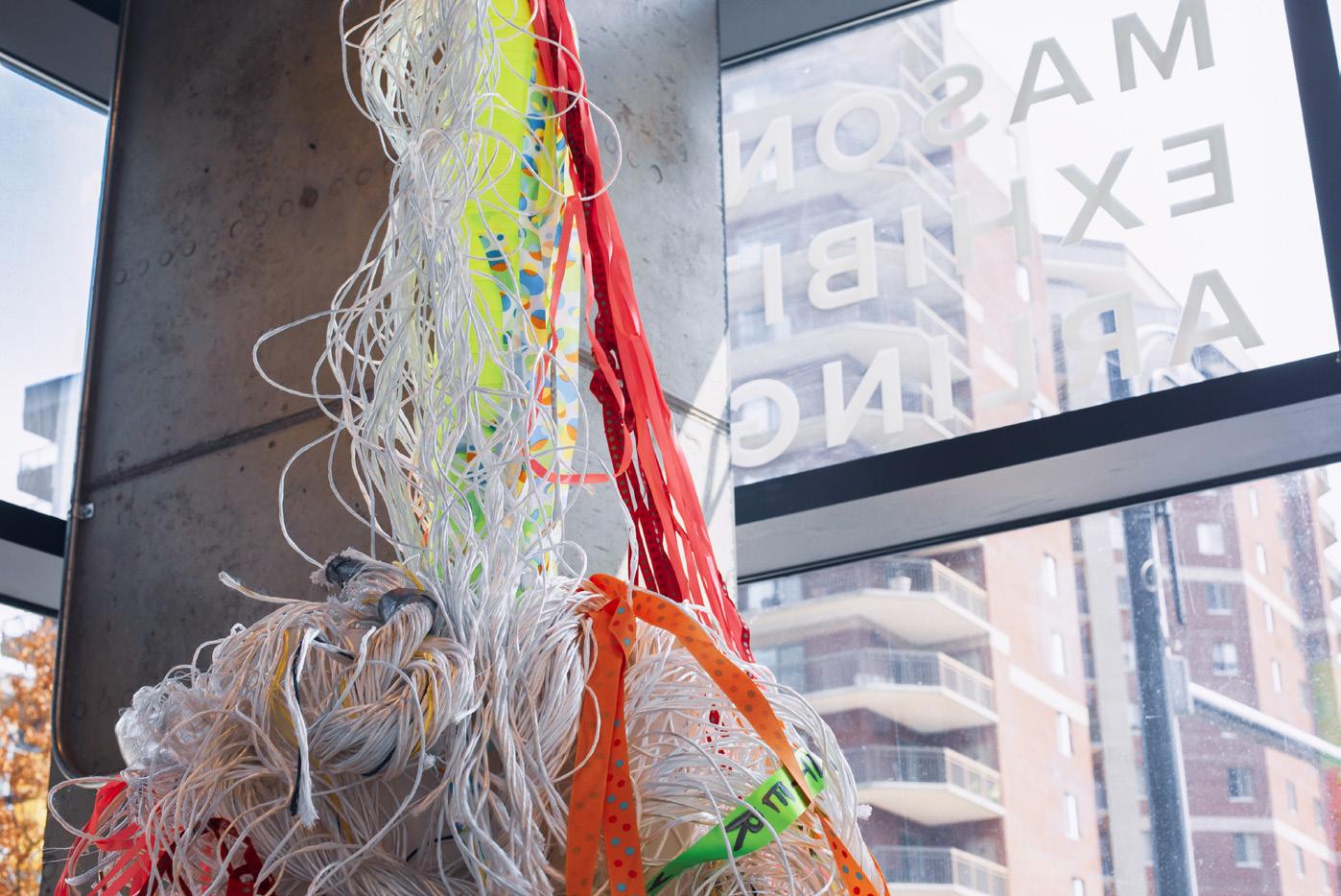 In Party Popper/Plague Tower (2022), Wrbican expands on how her environmental concerns became more pressing during the COVID-19 pandemic, as shipments increased worldwide, generating a suffocating overflow of plastic boxes, bags, wraps, bottles, and containers. This sculpture made out of a 150-foot nautical hawser, a thick braided line used to tow large container ships into port, adorned with colorful satin ribbons, references the shape of commemorative plague towers built in Central Europe in the 17th and 18th centuries. These towers were meant to ward off the plague and protect communities from future pestilences.