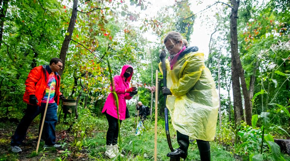 est fires only to be replaced by billowing smoke that dissipates to reveal a ravaged landscape. As the music and projected imagery gradually shift to Kehoe’s 200 Trees video, accompanied by Basinki’s Watermusik 11 , the performers slowly begin to move forward, miming the action of planting trees and saying phrases like “to provide shade,” “to generate oxygen,” “to reduce erosion,” and “to help cool our planet.” This introductory performance was followed by a socially engaged tree planting action at the George Mason University Fairfax campus where 100 native trees of northern Virginia were planted.