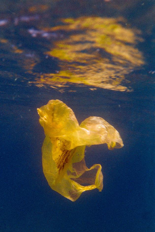However, irony is followed by the contradiction in capturing these tangible pollutants through an aesthetic lens. After collecting the bags, Forsgren photographs them underwater. The result is a series of images that have a strange yet conflicting beauty. The translucent bags are adrift and float in the water while light passes through them. The way the light pierces through the bags creates a subtle halo effect attributing to each an almost divine or sublime presence.