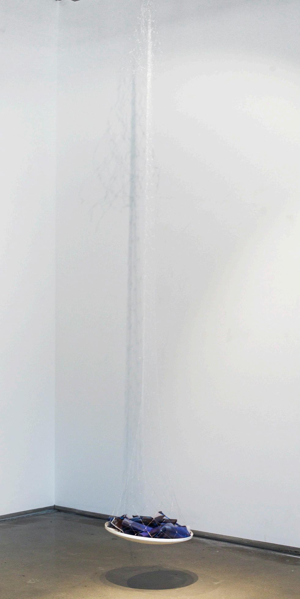 Oh’s work takes shape using found objects, reused and recycled materials, and photography. A convenient matter is a hanging sculpture that holds black and blue abstract photographs of a reused plastic bottle taken at night. These images, printed onto second-hand vellum, are contained in a used Christmas tree netting wrapped around a discarded plastic cap. The fragile net hangs from the ceiling and drops 13-foot toward the ground. This delicate sculpture evokes images of trapped water, while the net simultaneously references the impossibility of such containment. It symbolizes how water sustainability is getting out of (our) hands.