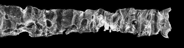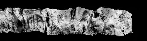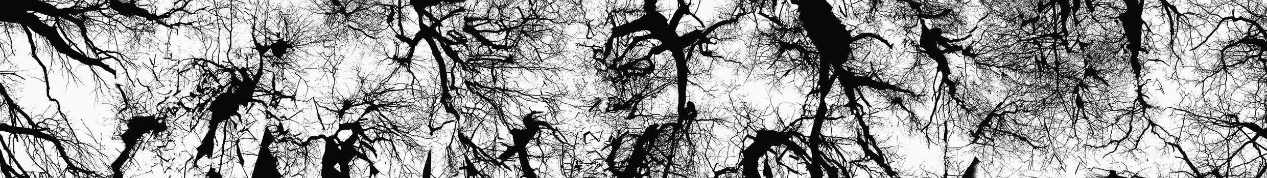 Responding to these findings, Isaac makes a series of panoramic photographs of tree canopies. Black silhouettes of trees stand out against a white background. His panoramas convey a sense of collaboration and unity—the system works better when it works together. For Isaac, these images render the ‘secret lives of trees’ and allow us to create a visual image of their underground network. In the words of Peter Wohlleben: “Under the canopy of the trees, daily dramas and moving love stories are played out. Here is the last remaining piece of Nature, right on our doorstep, where adventures are to be experienced and secrets discovered.”[2]
