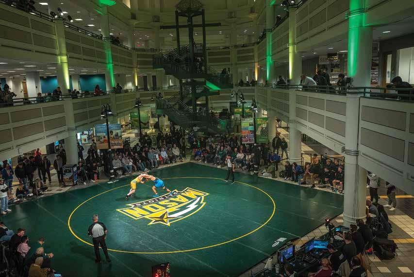 SHOWDOWN IN THE JC—In the inaugural showdown match held in the Johnson Center food court, the George Mason wrestling team earned a 29-9 win against the University at Bufalo to finish the season unbeaten. The Patriots were the only undefeated NCAA Division I team with seven wins and led the Mid American Conference (MAC) standings with a 5-0 record their first ever five win season in MAC competition. See more about their season on page 9. Photo by