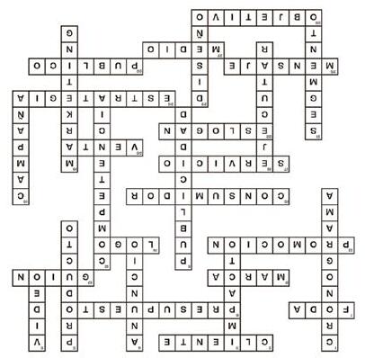 1. Herramienta para organizar las tareas y plazos de un proyecto. / 3. Efecto del anuncio sobre la audiencia. / 4. Mensaje de promoción. / 5. Bien que se vende. / 6. Promoción en formato audiovisual. / 11. Parte de la campaña que pretende aumentar la distribución, ventas o visibilidad de la marca. / 12. Rivalidad entre empresas con productos o servicios similares. / 16. Trabajo publicitario ideado para posicionar una marca y mantenerla en la mente de las personas. / 18. Poner en marcha el plan de trabajo. / 19. Profesión que tiene el objetivo de conectar a las personas con lo que compran o desean adquirir. / 21. Pequeño grupo que divide a los consumidores: ...de mercado. / 23. Profesión que combina la creatividad, el marketing y los medios visuales.