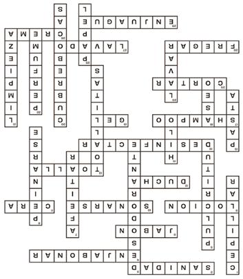 2. Conjunto de bienes y servicios que ayudan a preservar la salud pública. / 4. Frotar el jabón en el cuerpo al bañarse. / 6. Producto de limpieza para el cuerpo, puede ser sólido, líquido o en polvo. / 9. Líquido cosmético, se aplica directamente sobre la piel. / 10. Expulsar el moco en papel: ...la nariz. / 11. Sirve para limpiar superficies y dejarlas brillosas. / 12. Baño, regaderazo o.../ 13. Pieza de tela rectangular, sirve para secar el cuerpo. / 16. Limpiar las superficies para eliminar bacterias, virus y otros microorganismos. / 17. Producto para limpiar el cabello y el cuero cabelludo. / 19. Producto líquido usado para eliminar la suciedad y el sudor del cuerpo: ...de baño. / 24. Práctica de cuidado personal, consiste en reducir la longitud de las uñas de las manos y los pies./ 26. Limpiar con estropajo, cepillo o trapo empapados en una solución limpiadora. / 27. Proceso de limpiar las manos con agua y con jabón: ...de manos. / 28. Proporciona a la piel el agua que necesita, dejándola suave y con buen aroma: ...hidratante. / 29. Solución líquida utilizada después del cepillado de dientes: ...bucal.