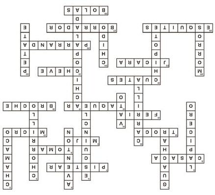 / 8. Camiseta deportiva usada especialmente en futbol. / 9. Beber alcohol u otras bebidas. / 11. Vocativo que suple la palabra hijo. / 12. Vehículo de motor pesado, sirve para jalar grandes cargas. / 13. Vehículo de transporte público más pequeño que el autobús. / 15. Dinero suelto y de bajo valor. / 16. Comer tacos. / 18. Adorno de joyería que se prende en la ropa. / 19. Amigos cercanos / Mellizos nacidos en el mismo parto. / 21. Palabra informal que significa cerveza. / 23. Vasija pequeña de madera o loza en la que se toma agua. / 25. Fiesta nocturna: juerga o... / 26. Elotes hervidos y desgranados, llevan mayonesa, queso, limón y chile en polvo. / 27. Instrumento de mano que sirve para borrar trazos. / 28. En el norte de México es la jerga para referirse a los dólares estadounidenses.