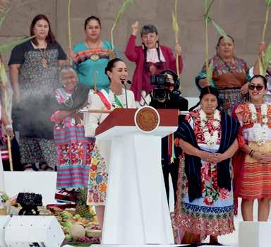 Más tarde, Sheinbaum ofreció una co mida a lxs mandatarixs del mundo que la acompañaron durante su ceremo nia de investidura y tomó protesta a lxs integrantes de su Gabinete. Horas des pués recibió el bastón de mando de los 70 pueblos originarios y el afromexicano. “Tú eres la voz de las que no tuvimos voz por mucho tiempo… Hoy las muje res indígenas estamos de fiesta, pero no sólo las mujeres indígenas, estamos de fiesta todas las mujeres”, le dijo una de las guías espirituales que llevaron a cabo el ritual de limpia y purificación.