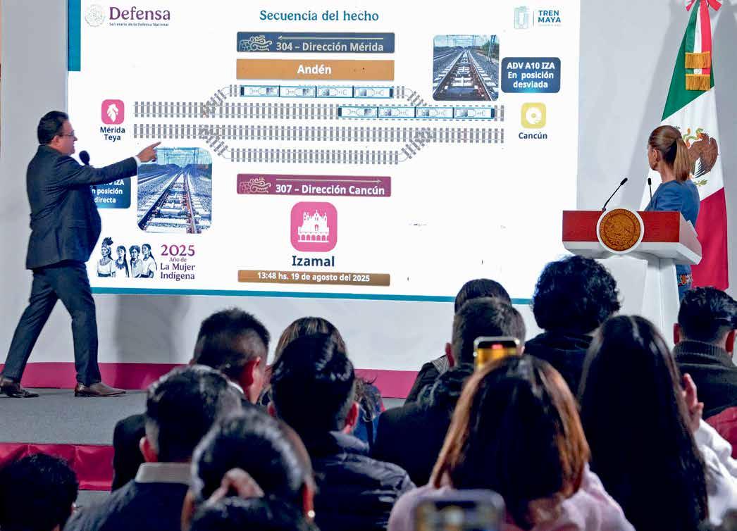 El director general del Tren Maya, Óscar David Lozano, informó ayer que el “percance” en la estación Izamal registrado el martes ocurrió porque un aparato de cambio de vía se activó de manera inesperada cuando el tren 304 pasó al segundo bogie. Esto ocasionó que quedara recargado contra el convoy 307 que se encontraba estacionado en el andén. Durante la conferencia matutina de la presidenta Claudia Sheinbaum, recalcó que se trató de una “anomalía” que deberán analizar. Sin embargo, acotó que gracias a la reacción de la maquinista, el riesgo no pasó a mayores. Resaltó que los protocolos de seguridad y de protección civil de la estación se activaron de inmediato para auxiliar a 261 pasajeros, mientras que personal de la Comisión Dictaminadora de Accidentes Ferroviarios y peritos de la Fiscalía General de la República (FGR) acudieron al sitio para iniciar las investigaciones.