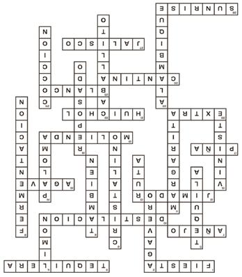 desde la siembra del agave hasta el embotellado. / 7. Tequila envejecido en barricas por más de un año, lo que le da un sabor suave. / 10. Proceso para separar el alcohol del resto del líquido y obtener tequila puro. / 12. Trabajador agrícola especializado en cortar las hojas del agave. / 16. Planta suculenta usada para producir tequila: ...azul. / 17. Parte central del agave que se cuece para extraer los jugos que luego se fermentan. / 19. Técnica para triturar las piñas cocidas y extraer el jugo necesario para la fermentación. / 20. Tequila madurado en barrica por más de tres años: ...añejo. / 21. Muchas botellas de tequila artesanal están decoradas con arte..., símbolo de identidad cultural. / 25. Tequila transparente que no pasa por barricas, su sabor es fuerte. / 26. Lugar tradicional mexicano donde se sirven bebidas alcohólicas. / 27. Es la cuna del tequila, pues tiene las principales destilerías. / 28. Cóctel hecho con tequila, famoso por su apariencia de atardecer: tequila...
