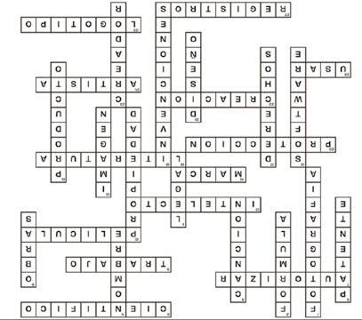 3. Área práctica del conocimiento: campo... / 7. Acción de reconocer y conceder el cumplimiento de un derecho. / 9. Resultado de la actividad humana remunerada. / 10. Historia grabada y proyectada en la pantalla. / 12. Facultad de entendimiento del ser humano, de esa forma adquiere conocimientos. / 14. Construida a partir del nombre, logotipo, eslogan, diseño y tono de comunicación. / 18. Expresión artística a través de las palabras y la escritura. / 20. Significa que garantiza el respeto y cumplimiento del derecho de propiedad. / 22. Nuevo concepto, idea, proyecto o producto. / 24. Persona que se dedica a alguna de las bellas artes. / 25. Hacer funcionar un producto. / 26. Símbolo gráfico de una marca, empresa o institución. / 27. Documentos legales que sirven como evidencia.
