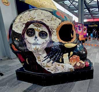 chil, papel picado y veladoras. Pero el toque mexicano se acentúa con las especies elaboradas en cartonería por la Red de Artesanos Anáhuac, acompañadas de dos cráneos gigantes hechos por Carlos Álvarez e intervenidos por Daniel Sánchez “Reko”.