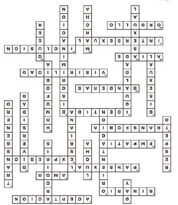 exclusivamente como hombre o mujer: género no... / 8. Libertad en las relaciones afectivas, sin prejuicios: ...libre. / 10. En sus relaciones no importa cuál sea la identidad o expresión de género del otro. / 13. Manera de mostrar la identidad de género a través de la ropa, actitud o apariencia: ...de género. / 14. Capacidad de comprender a otros, escuchando su experiencia sin juzgar. / 15. Discriminación o violencia hacia personas transgénero. / 18. Forma de percibirse: hombre, mujer, ambos, ninguno: ...de género. / 20. Emblemas de colores, representan distintas identidades y luchas dentro de la comunidad. / 21. Hacer que las personas LGBTIQ+ sean escuchadas y respetadas en la sociedad. / 22. Apoya y defiende los derechos de la comunidad LGBTIQ+ aunque no pertenezca a ella. / 26. Creación de espacios donde todas las personas se sientan parte. / 27. Persona que nació con características biológicas que no encajan en las categorías típicas de masculino o femenino. / 28. Sentimiento de aceptación y dignidad por ser quien eres.